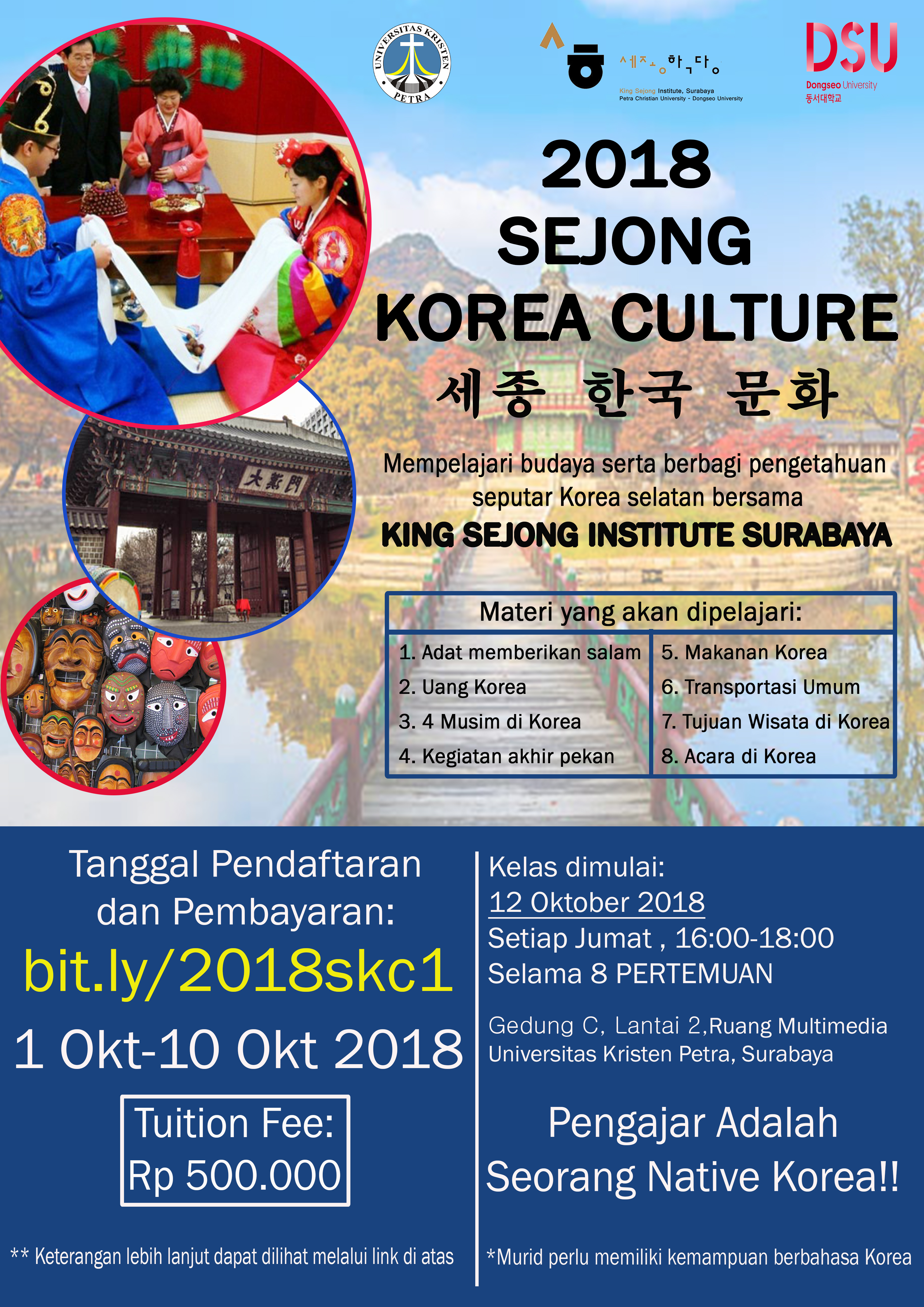 King Sejong University yang merupakan program kerjasama antara Universitas Kristen Petra dengan Dongseo University, mengadakan acara klas program 2018 Sejong Korea Culture. Inti dari kelas ini adalah mempelajari budaya dan pengetahuan seputar Korea Selatan. Program ini akan dimulai pada 12 Oktober 2018 selama 8 minggu pertemuan setiap hari Jumat jam 16.00-18.00 WIB. Biaya program ini sebesar Rp.500.00,-
