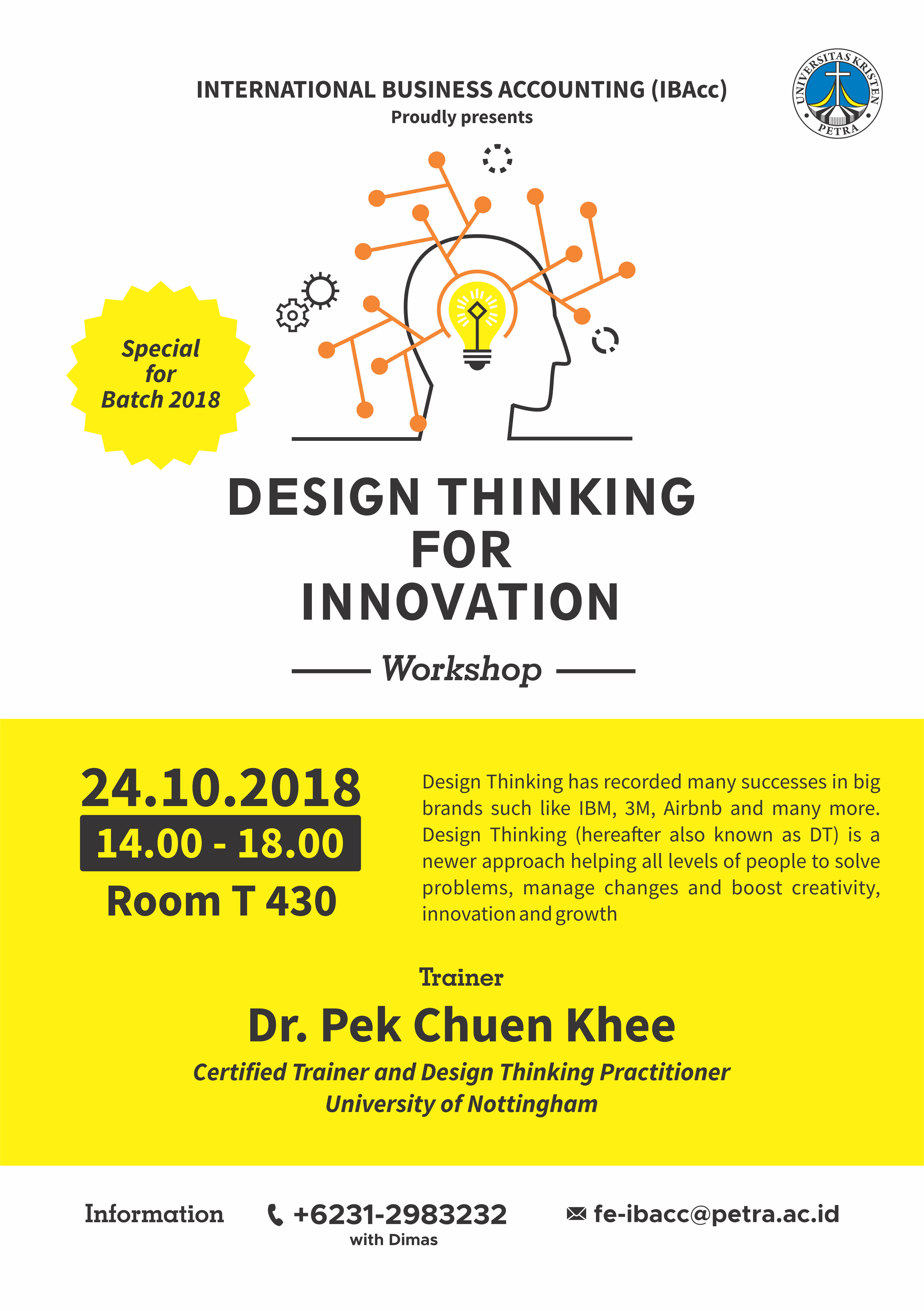 International Business Accounting Universitas Kristen Petra Surabaya menyelenggarakan workshop dengan tema " Design thinking for innovation." Dengan menghadirkan trainer bapak Dr. Pek Chuen Khee. Acara ini dilaksanakan pada 24 Oktober 2018, bertempat di ruang T.430.