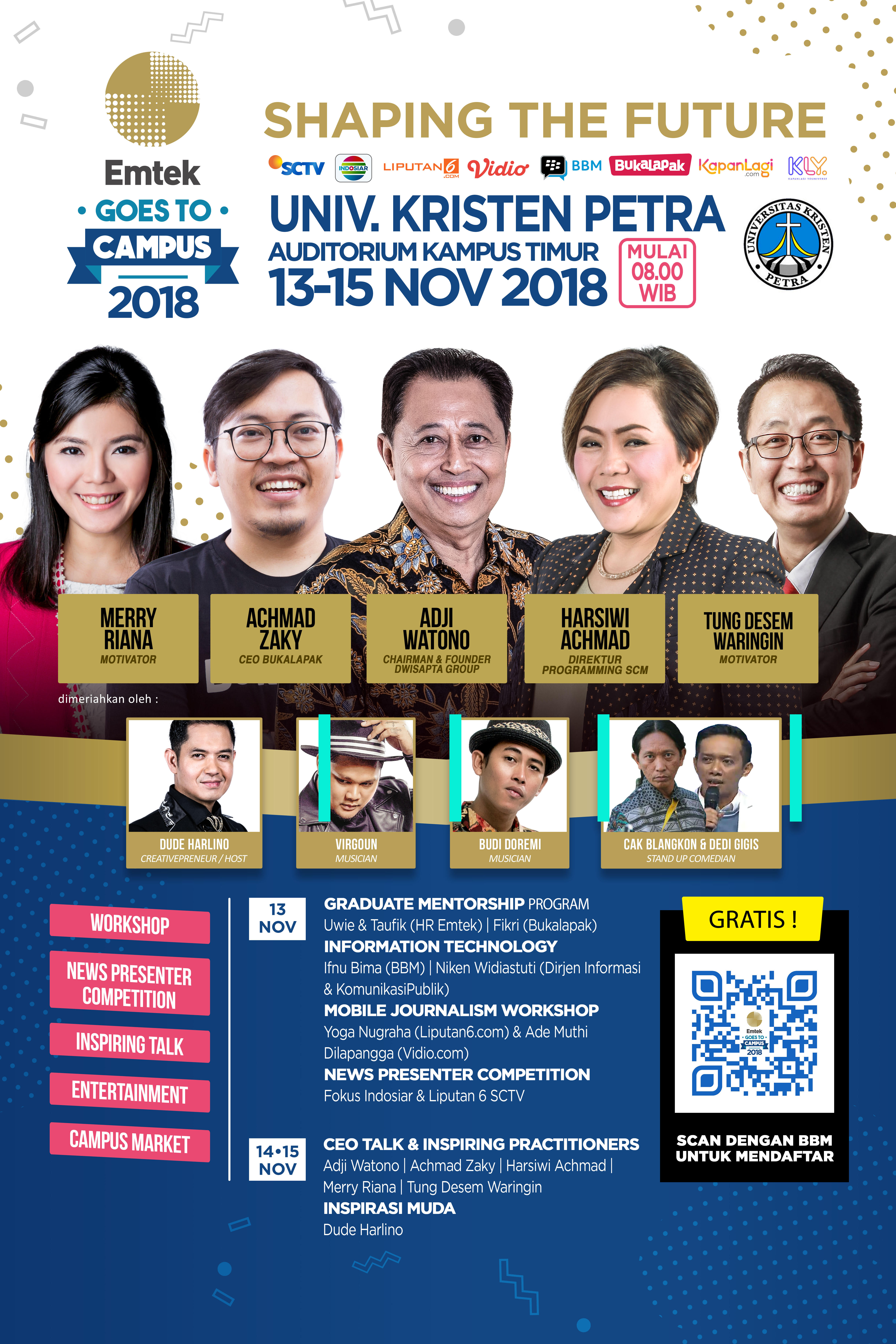Serangkaian acara akan tersajikan dalam kemeriahan Emtek goes to campus 2018 di kampus Universitas Kristen Petra Surabaya. Workshop, inspiring talk, entertainment, dan lomba-lomba dihadirkan di dalam acara yang berlangsung pada tanggal 13-15 November 2018. Dan akan hadir pula beberapa public figur yang akan menjadi nara sumber pada acara ini.