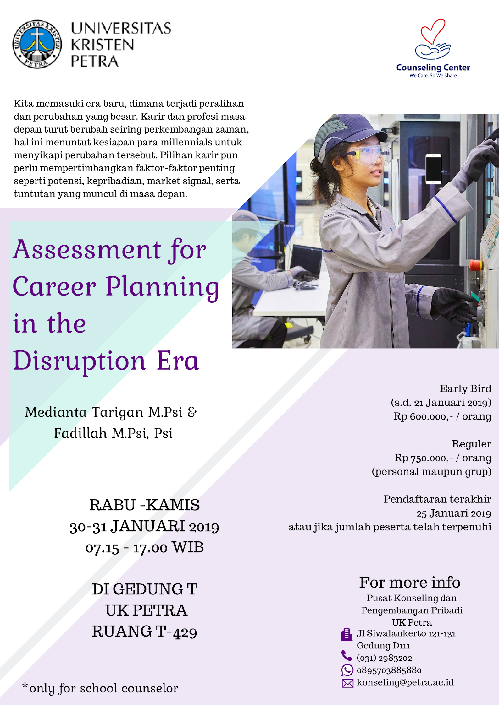 Pusat Konseling dan Pengembangan Pribadi Universitas Kristen Petra Surabaya mengadakan seminar Assessment for career planning in the disruption era. Acara ini dilaksanakan pada 30-31 Jauari 2019 bertempat di gedung T.429 Universitas Kristen Petra Surabaya. Dengan menghadirkan narasumber Medianta Tarigan, M.Psi. dan Fadillah, M.Psi.