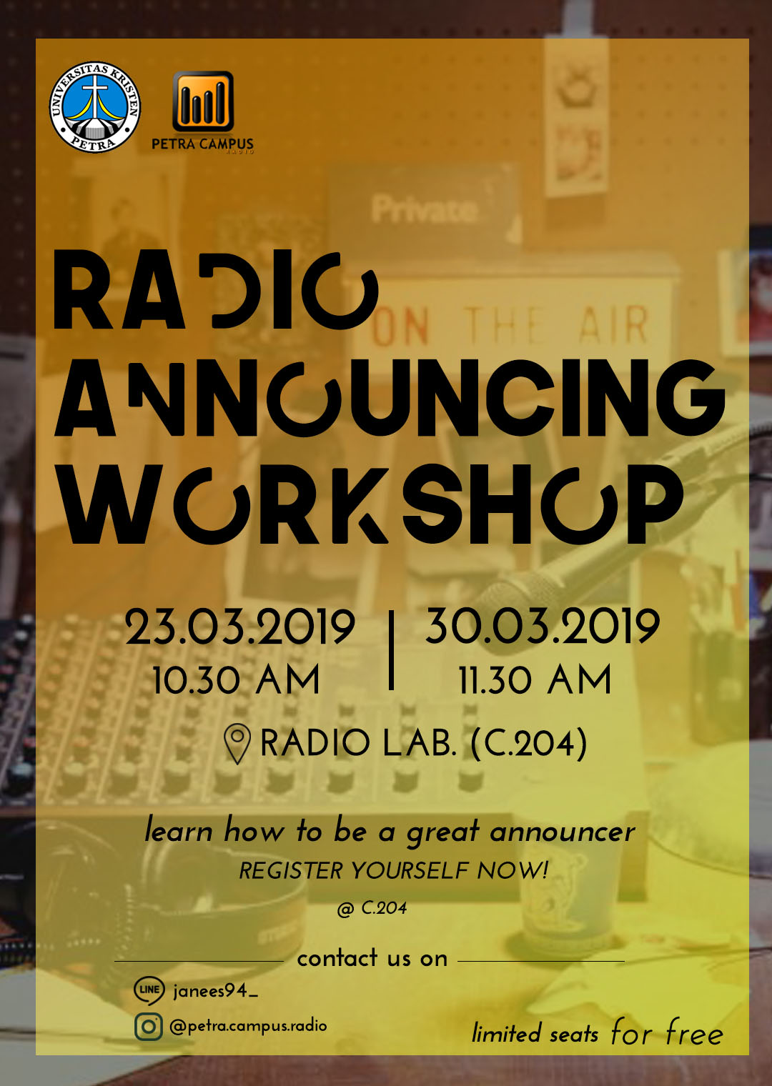 Program Studi Ilmu Komunikasi UK Petra, mengadakan workshop dengan topik Radio Announcing Workshop. Acara ini diselenggarakan pada 23 Maret 2019 dan 30 Maret 2019. Bertempat di ruang Lab. Radio (C.204).