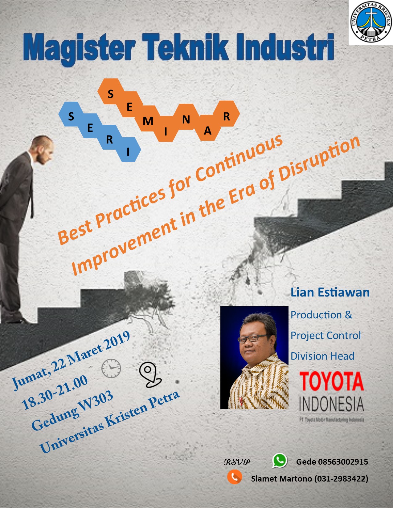 Magister Teknik Industri Universitas Kristen Petra Surabaya mengadakan seminar dengan topik " Best practices for continuous improvement in the era of disruption". Acara ini dilaksanakan pada tanggal 22 Maret 2019, bertempat di gedung W.303. Dengan menghadirkan Lian Estiawan sebagai narasumber.