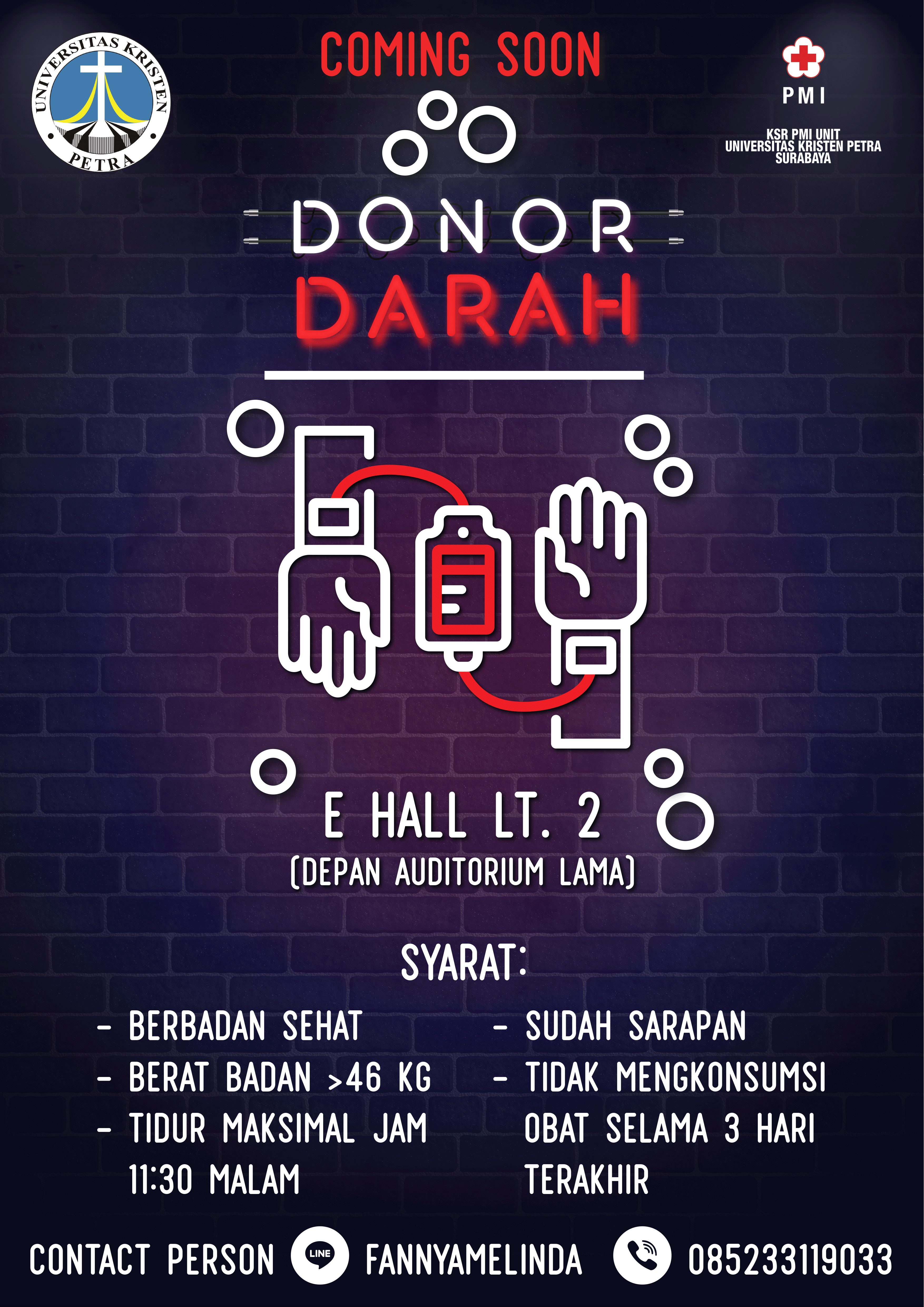 UKM KSR universitas Kristen Petra bekerja sama dengan PMI Surabaya mengadakan kegiatan donor darah pada tanggal 06 September 2019. Acara dilaksanakan di E-Hall lantai 2.