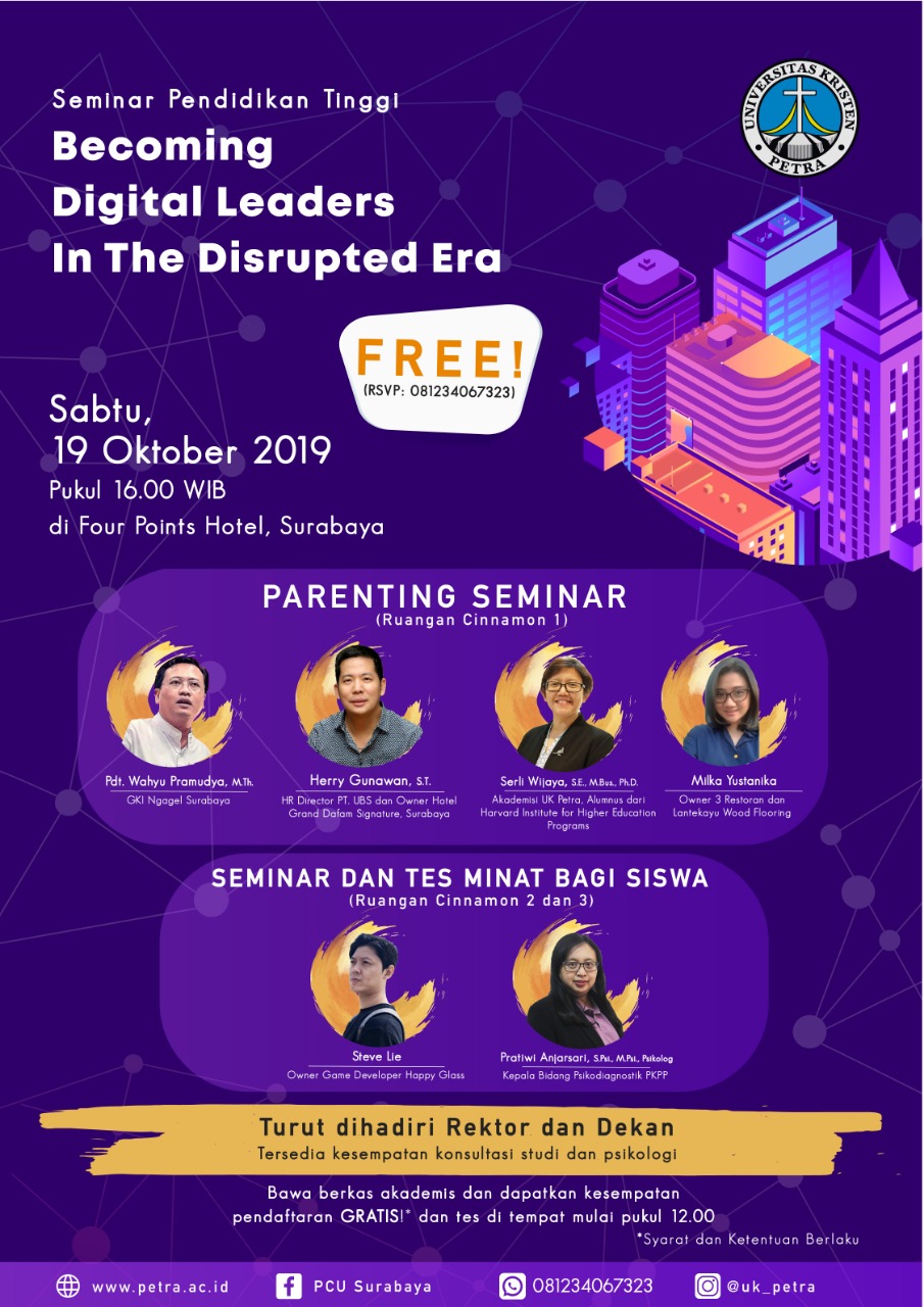 Universitas Kristen Petra Surabaya pada tanggal 19 Oktober 2019, bertempat di Four Points Hotel, Surabaya mengadakan seminar dan tes minat bagi siswa. Pada acara yang mengangkat tema "becoming digital leaders in the disrupted era" ada beberapa narasumber yang diundang hadir, yaitu: Pdt. Wahyu Pramudya, M.Th. dan Herry Gunawan, S.T., Serli Wijaya, Ph.D., dan Milka Yustanika, Steve Lie dan Pratiwi Anjarsari.