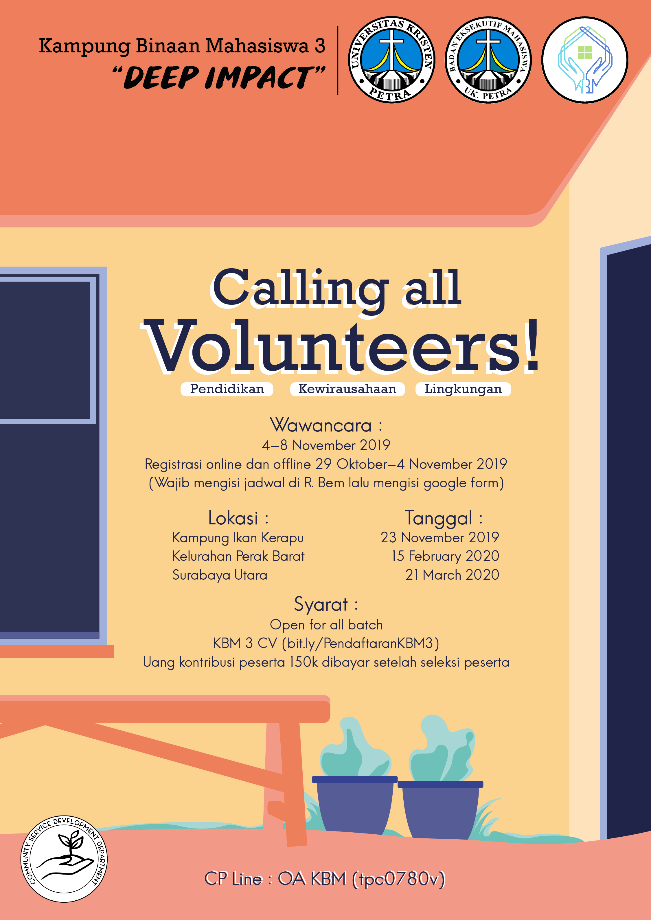 Badan Eksekutif Mahasiswa UK Petra mengadakan acara pengabdian kepada masyarakat. Acara ini berjudul "Kampung binaan mahasiswa 3: deep impact". Pendaftaran untuk acara ini dibuka dari tanggal 29 Oktober 2019 hingga 04 November 2019.