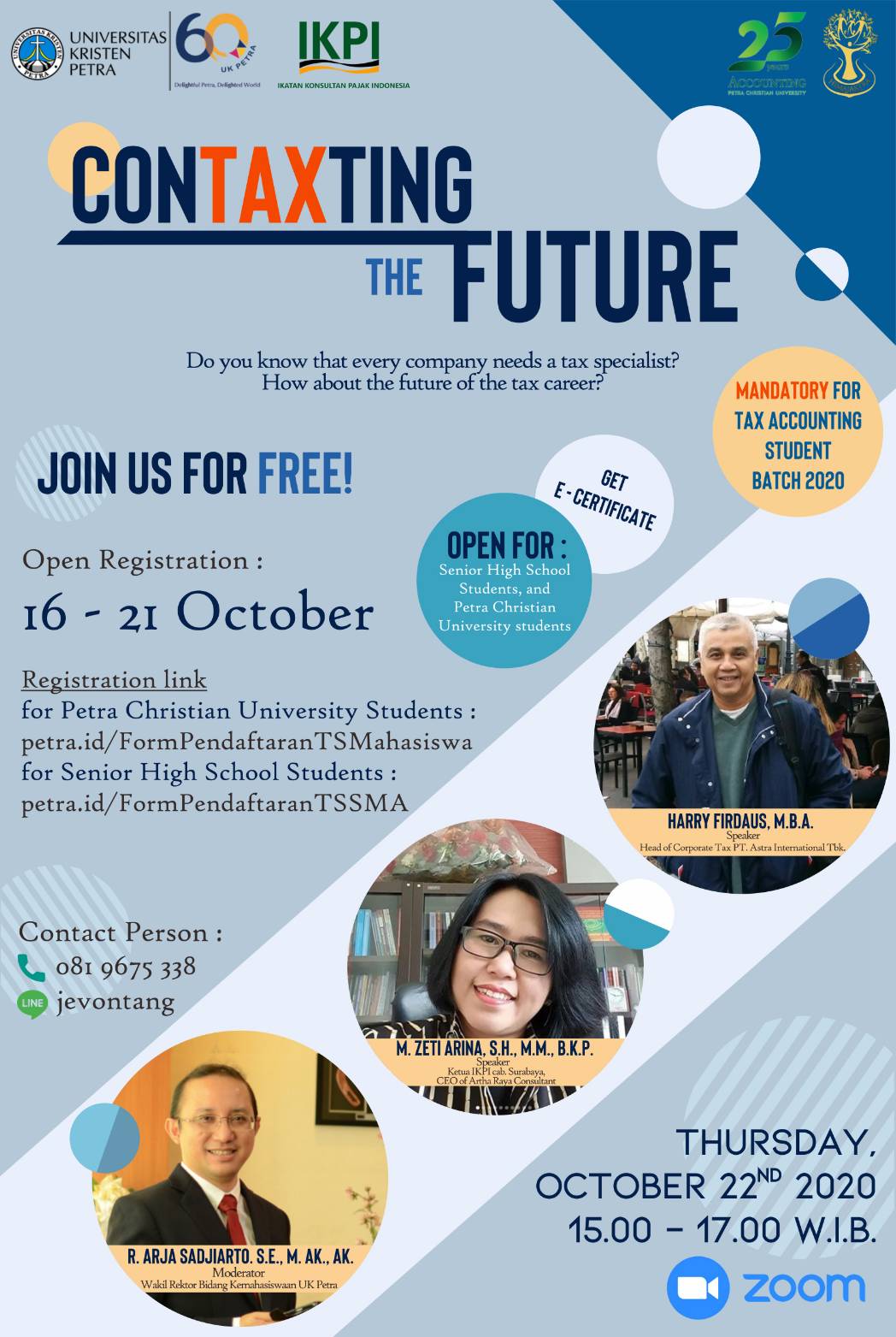 Program Akuntansi Pajak UK Petra, pada tanggal 22 Oktober 2020 mengadakan webinar dengan tema "Contaxting the Future". Dengan mengundang narasumber Harry Firdaus dan M. Zeti Arina, serta R. Arja Sardjiarto sebagai moderator. Acara webinar ini menggunakan aplikasi Zoom.