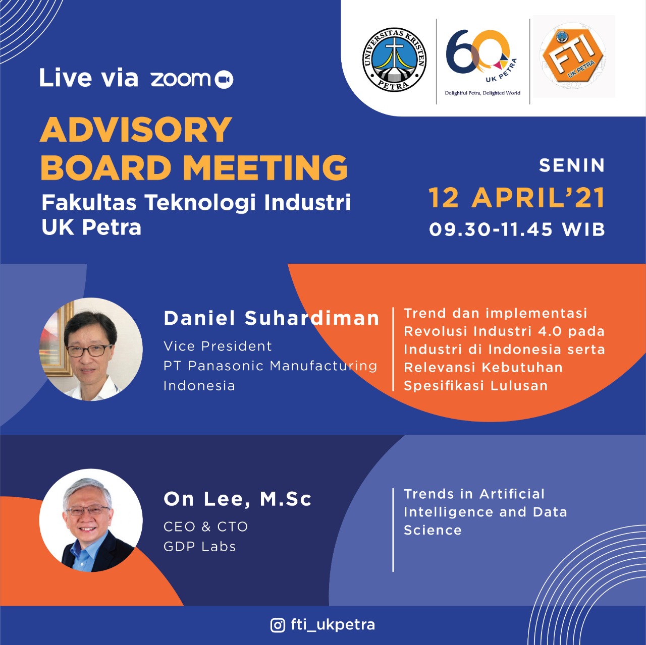 Pada Senin, 12 April 2021 Fakultas Teknik Industri Universitas Kristen Petra Surabaya, mengadakan acara "Advisory Board Meeting". Dengan narasumber Daniel Suhardiman dan On Lee. Acara ini diselenggarakan secara online melalui aplikasi Zoom.