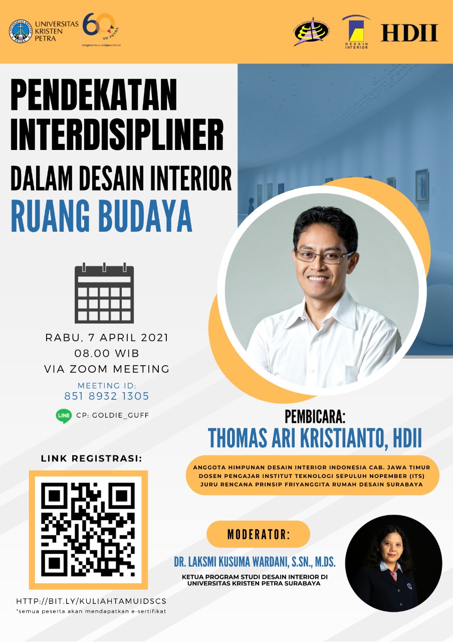 Rabu, 07 April 2021 jam 08.00 WIB, Program Studi Desain Interior Universitas Kristen Petra Surabaya mengadakan acara kuliah tamu dengan topik "Pendekatan interdisipliner dalam desain interior ruang budaya". Dengan narasumber Thomas Ari Kristianto. Acara ini diselenggarakan secara online melalui aplikasi Zoom.