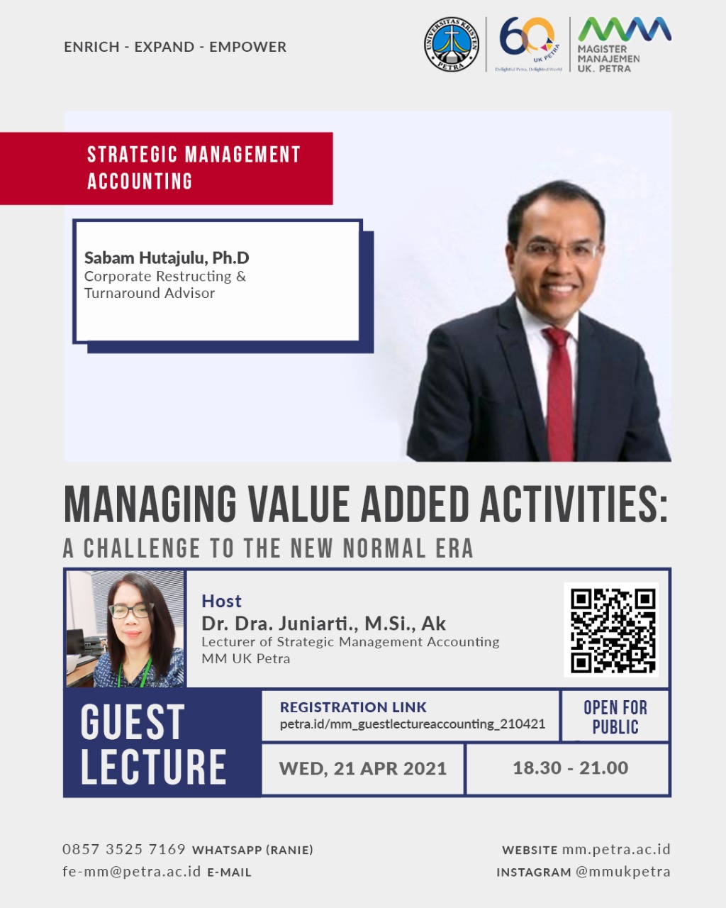 Pada tanggal 21 April 2021, Program Studi Magister Manajemen, mengadakan acara kuliah tamu. Acara yang digelar secara online ini menghadirkan Sabam Hutajulu, Ph.D. sebagai narasumber. Dengan topik pembahasan managing value added activities.