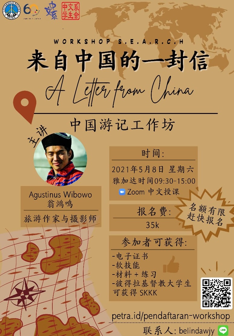 Pada tanggal 08 Mei 2021 Fakultas Sastra Universitas Kristen Petra Surabaya, mengadakan workshop dengan tema "a letter from China". Dengan narasumber Agustinus Wibowo, workshop ini dilaksanakan dengan daring melalui aplikasi Zoom. Biaya pendaftaran sebesar Rp.35.000.