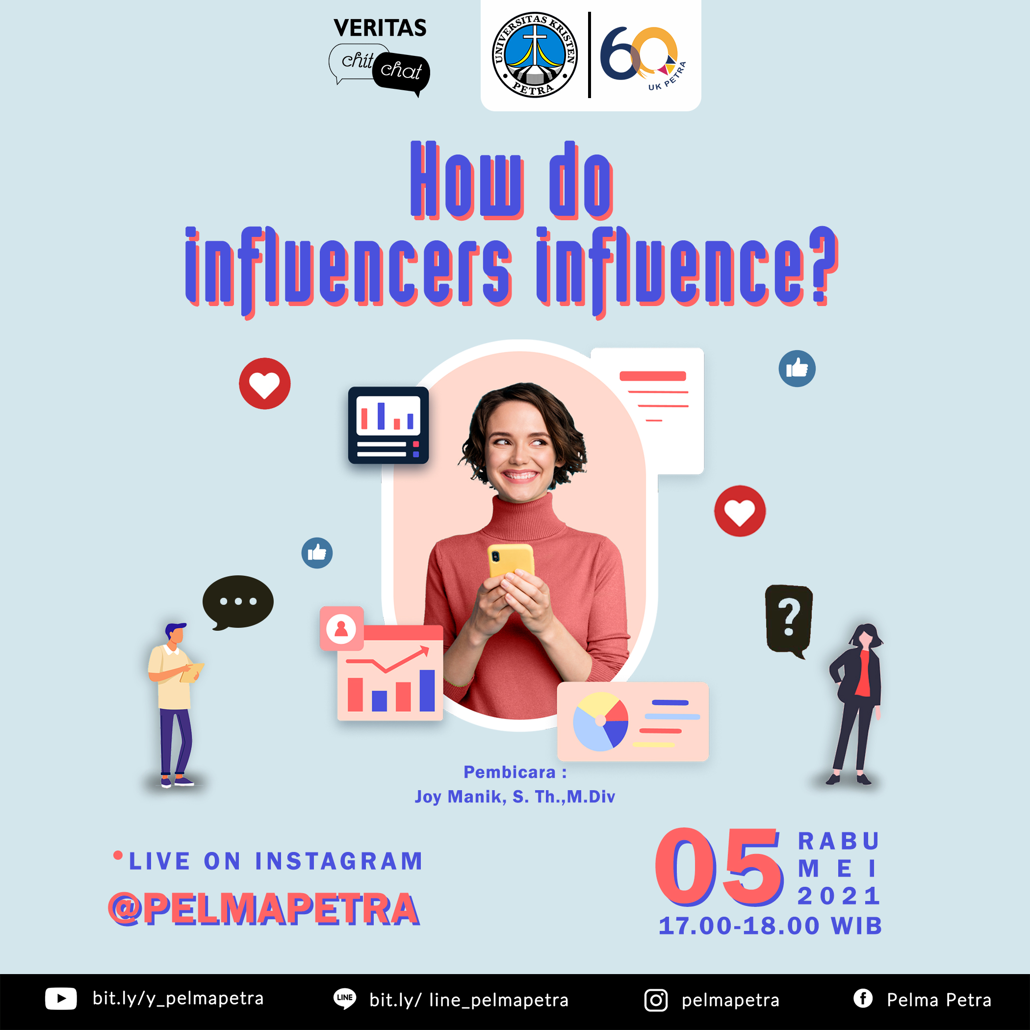 Pada tanggal 05 Mei 2021 jam 17.00 WIB, Pelayanan Mahasiswa Universitas Kristen Petra Surabaya mengadakan acara tanya jawab. Dengan narasumber Joy Manik S.Th., M.Div. acara ini mengambil tema "How do influencers influence? Acara ini disiarkan live Instagram @pelma.