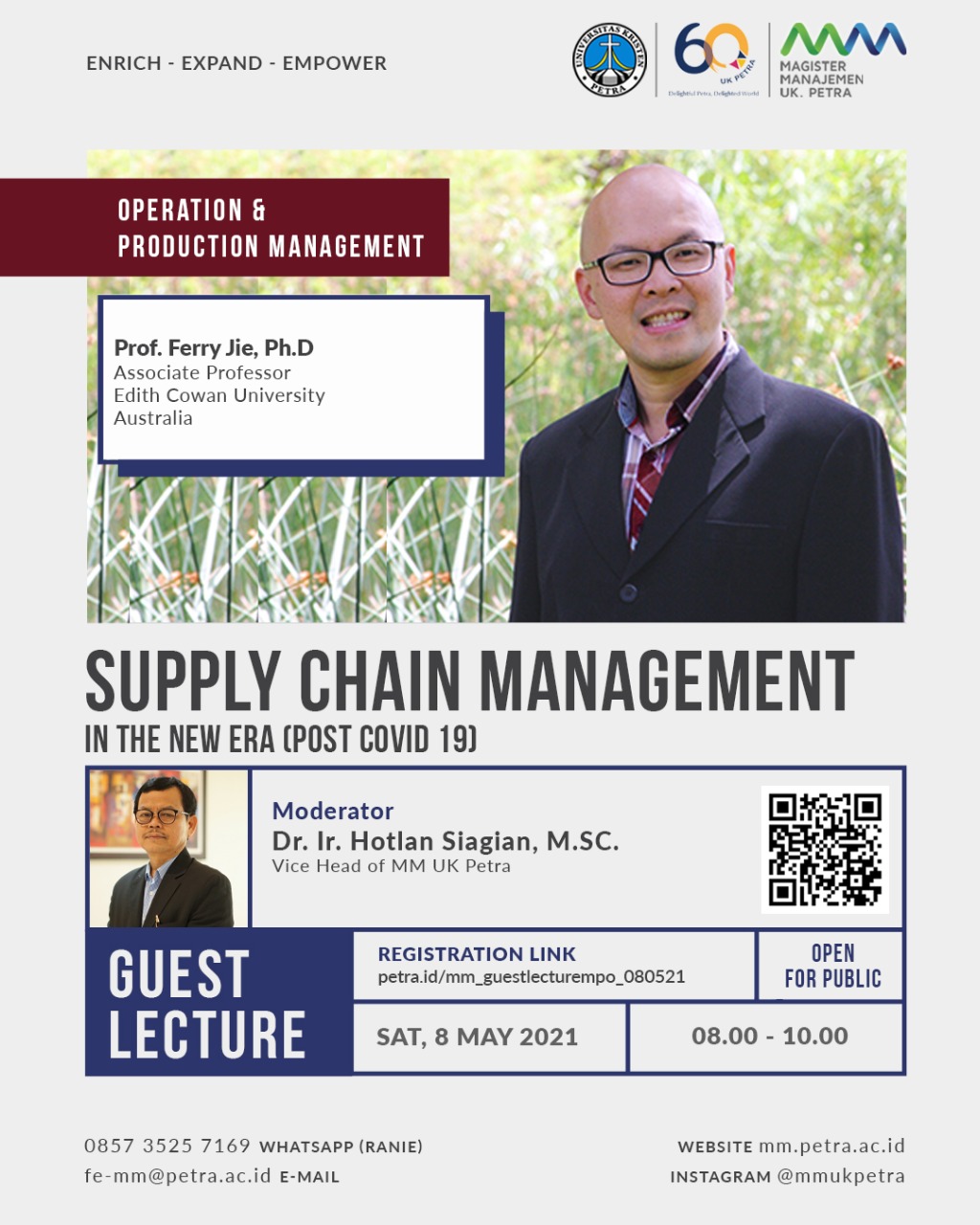 Pada tanggal 08 Mei 2021, Program Studi Magister Manajemen Universitas Kristen Petra Surabaya, mengadakan kuliah tamu dengan topik " Supply Chain Management". Acara ini menghadirkan Prof. Ferry Jie, Ph.D. sebagai narasumber. Acara ini dilaksanakan dengan cara online.