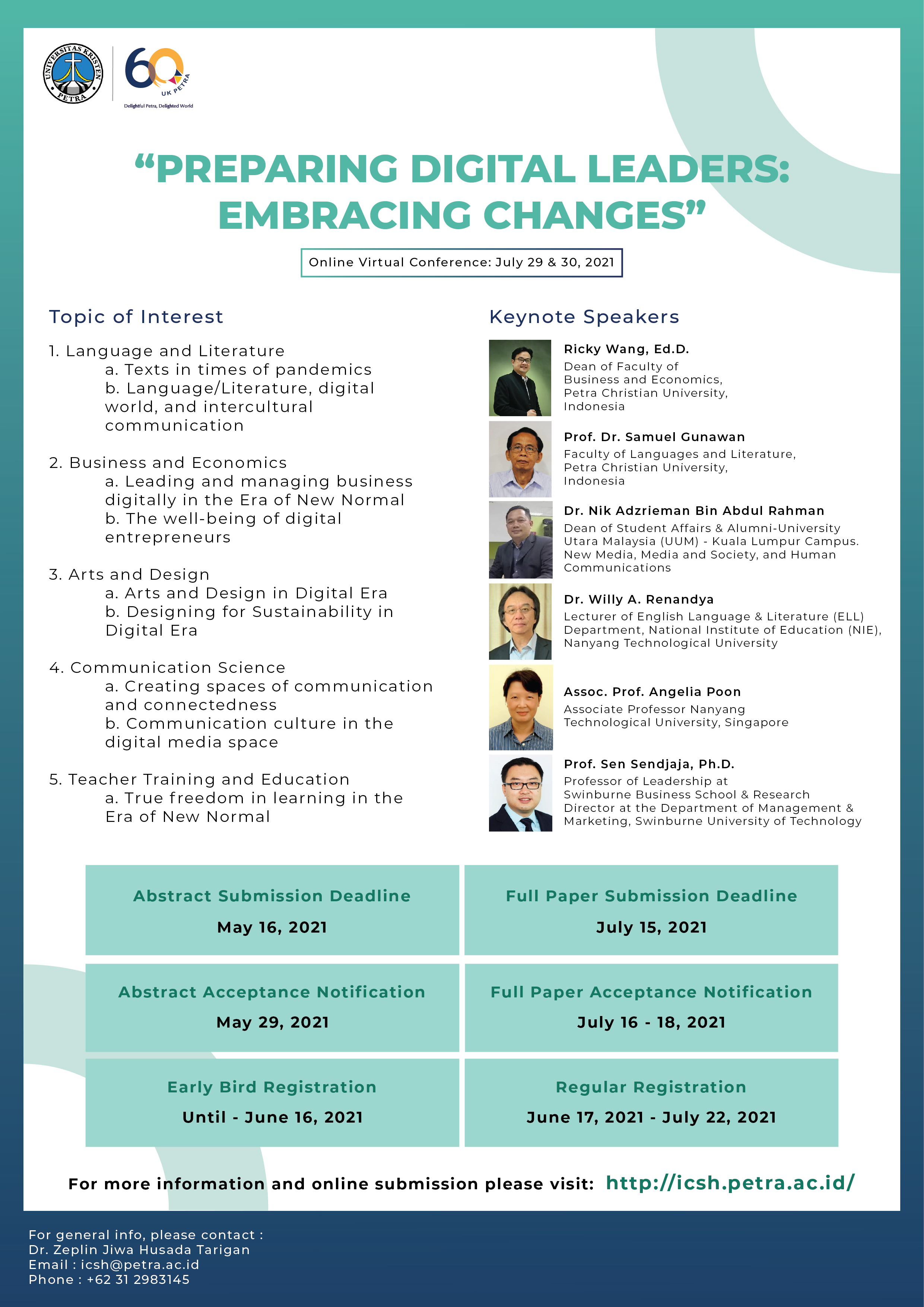 Universitas Kristen Petra mengadakan acara "International Conference on Social Science and Humanities (ICSH 2021): preparing digital leaders embracing changes". Acara ini diadakan secara online virtual conference pada tanggal 29 dan 30 July 2021.