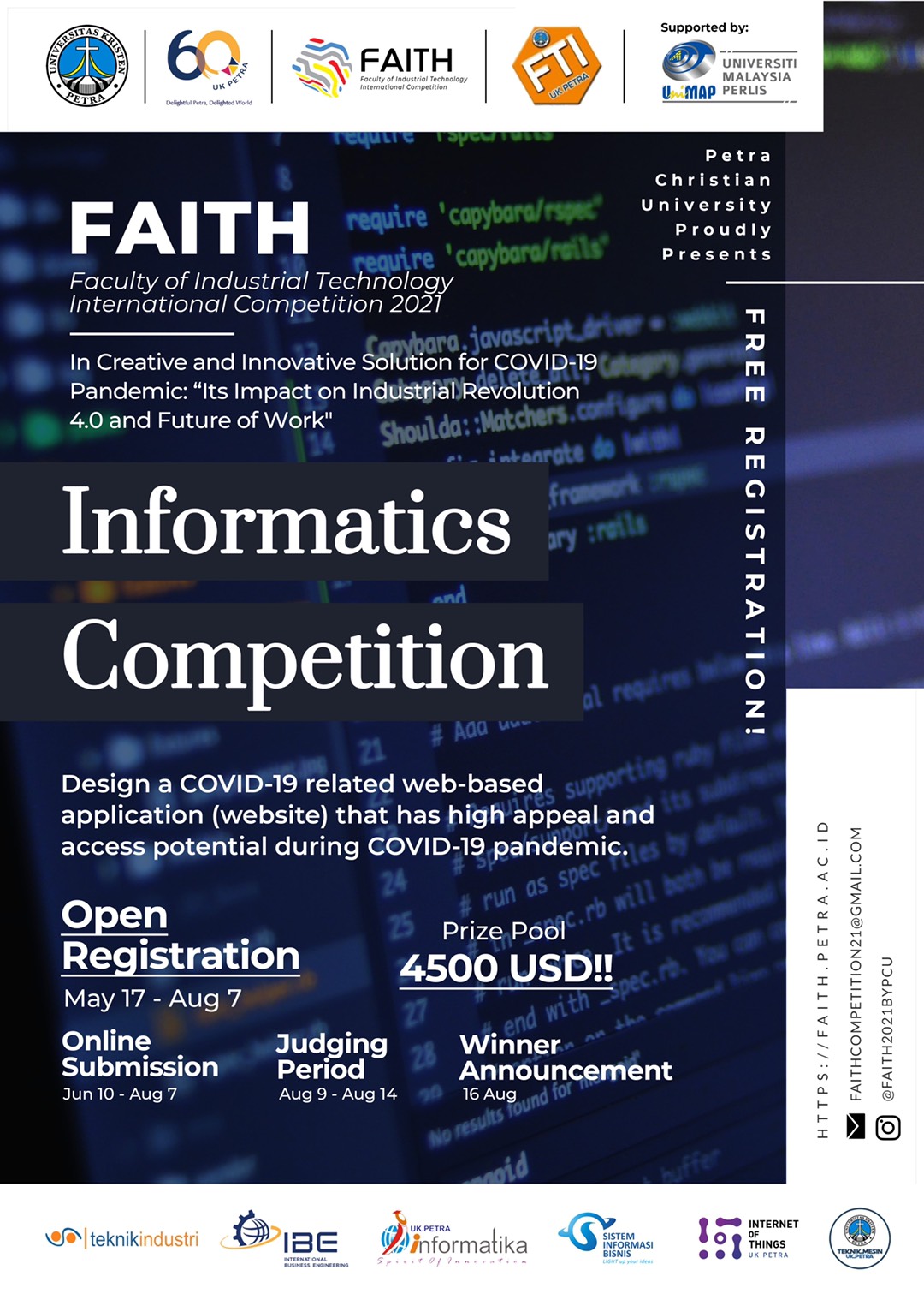 Fakultas Teknologi Industri Universitas Kristen Petra Surabaya, mengadakan kompetisi tentang industri creative didalam masa pandemi covid-19 ini. Pendaftaran dibuka apada 17 Mei hingga 07 Agustus. Dan pengumuman pemenang akan dilaksanakan pada tanggal 16 Agustus 2021. Total hadiah yang diperebutkan 4500 USD.