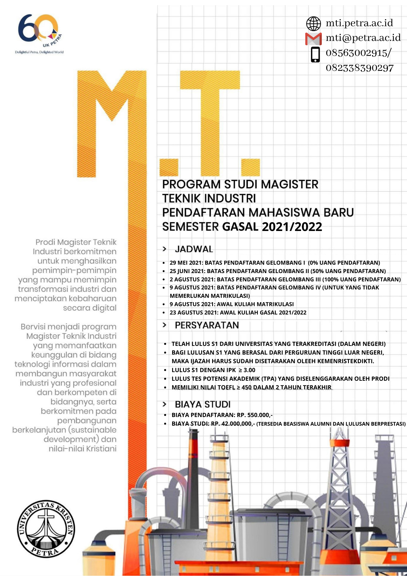 Pendaftaran untuk mahasiswa baru Magister Teknik Industri tahun semester gasal 2021/2022 dibuka kembali. Info selengkapnya ada di mti.petra.ac.id