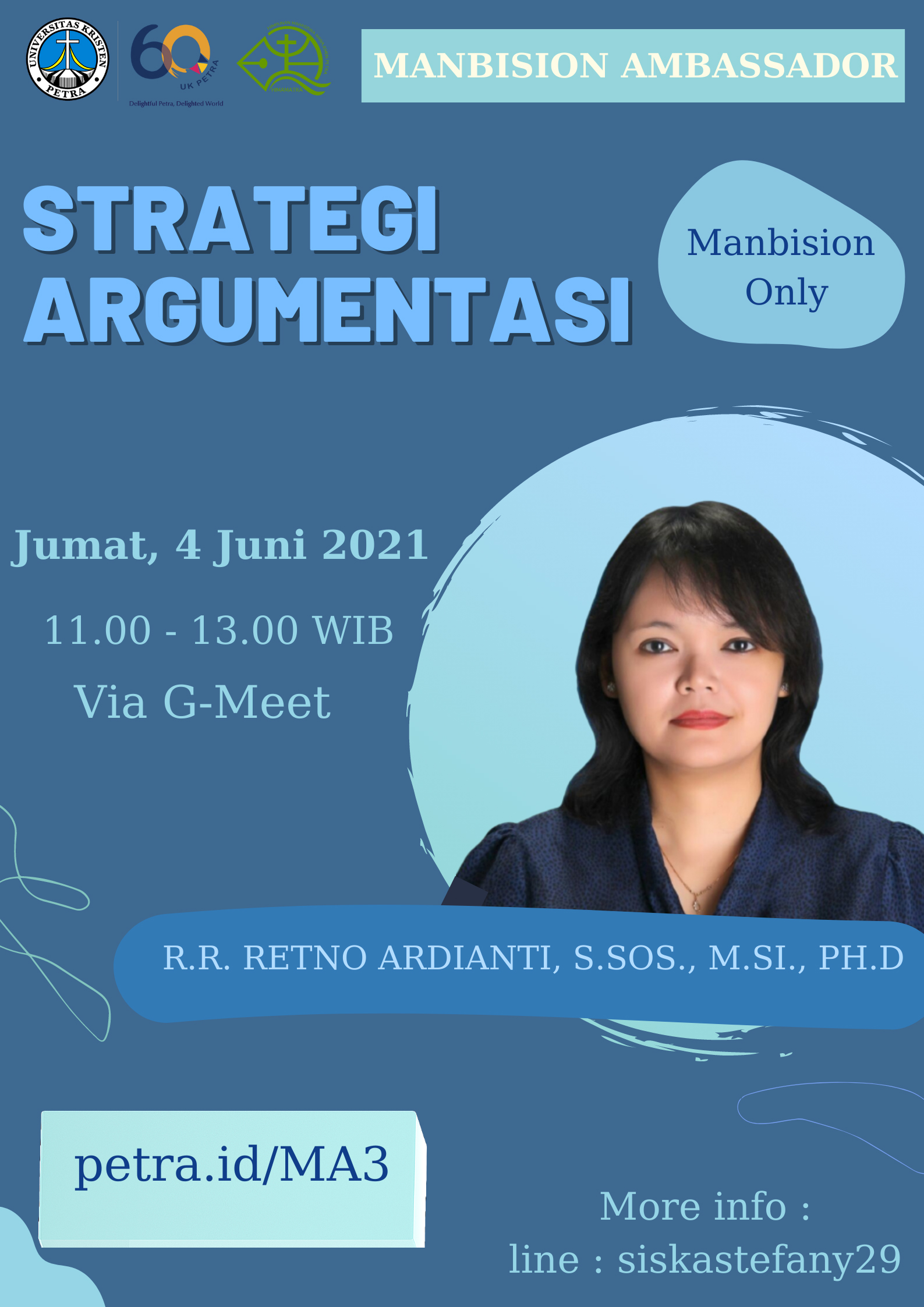 Pada tanggal 04 Juni 2021 jam 11.00 WIB, Program Manajemen Bisnis Universitas Kristen Petra Surabaya mengadakan talkshow dengan tema "Manbision ambassador: strategi pembuatan dan pemaparan argumentasi". Acara ini diselenggarakan secara online melalui Google Meet. Sebagai narasumber adalah R.R. Retno Ardianti, S.sos., M.Si., Ph.D.