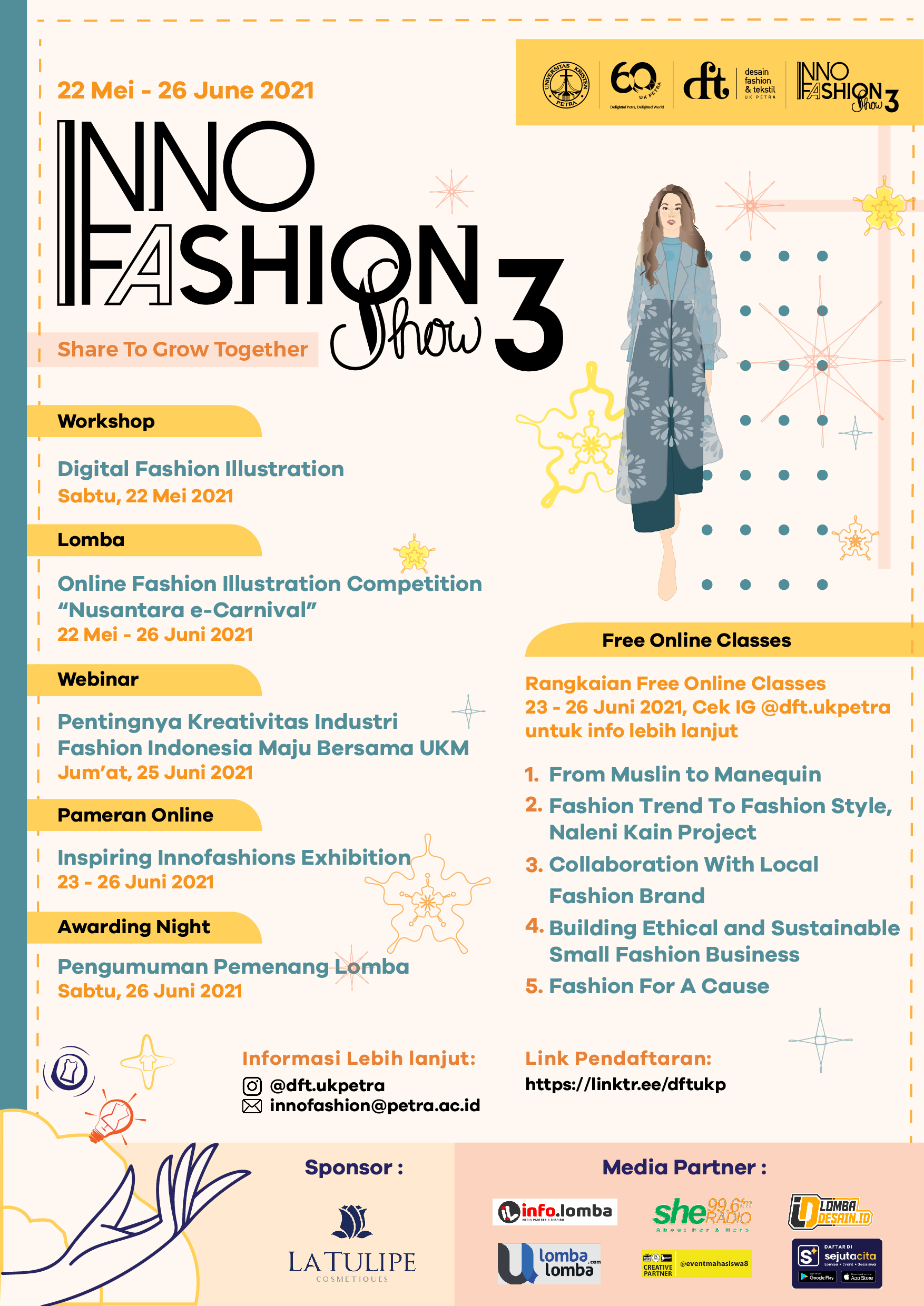 Pada tanggal 22 Mei -26 Juni 2021, Program Desain Fashion dan Tekstil Universitas Kristen Petra Surabaya mengadakan acara "Inno Fashion Show 3". Ada beberapa acara dalam kegiatan ini, antara lain: webinar, lomba desain, workshop serta pameran. Untuk informasi lebih lengkap bisa dilihat di instagram @dft.ukpetra
