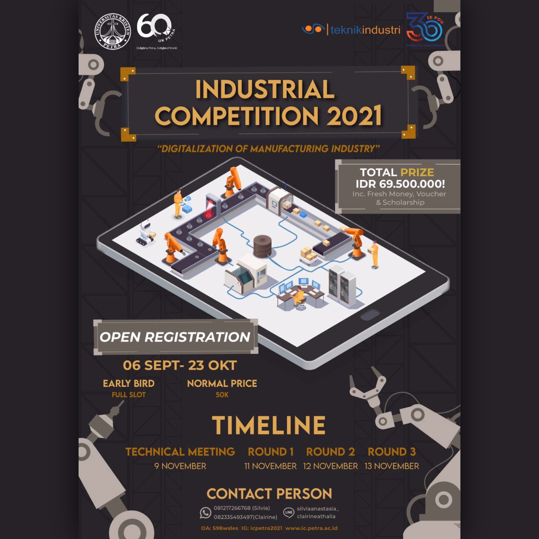 Program Studi Tekni Industri Universitas Kristen Petra pada tanggal 09-13 November 2021 akan mengadakan acara yang bertajuk "Industrial Competition 2021". Dengan memperebutkan total hadiah sebesar 69.500.000. Untuk keterangan lebih jelas silahkan melihat di www.ic.petra.ac.id