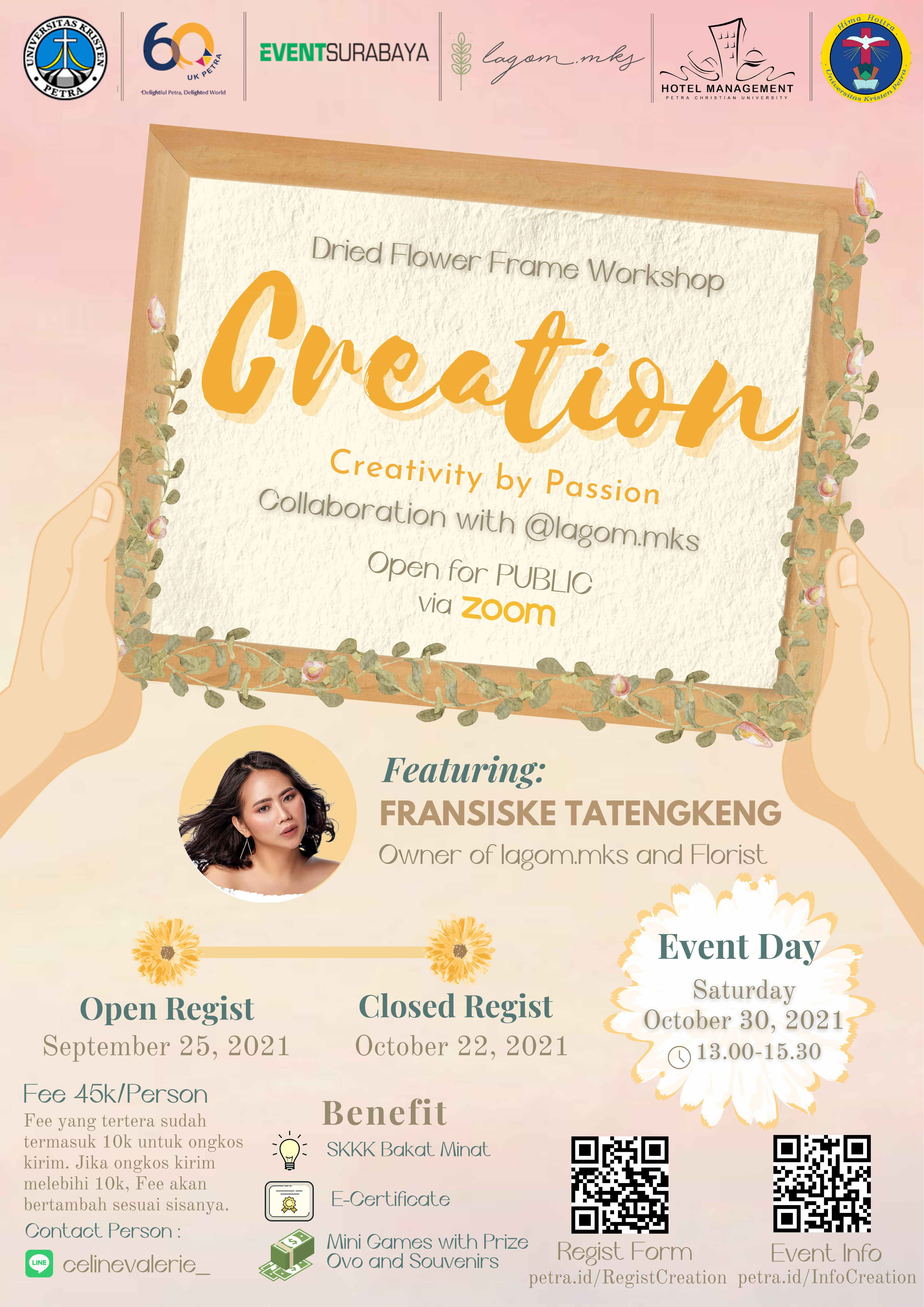 Pada vtanggal 30 Oktober 2021, Program Manajemen Perhotelan Universitas Kristen Petra Surabaya, mengadakan acara workshop dengan topik "Creation". Acara ini dilaksanakan pada tanggal 30 Oktober 2021 jam 13.00 WIB, dengan nara sumber Fransiske Tatengkeng. Acara ini dilaksanakan secara daring dengan aplikasi Zoom.