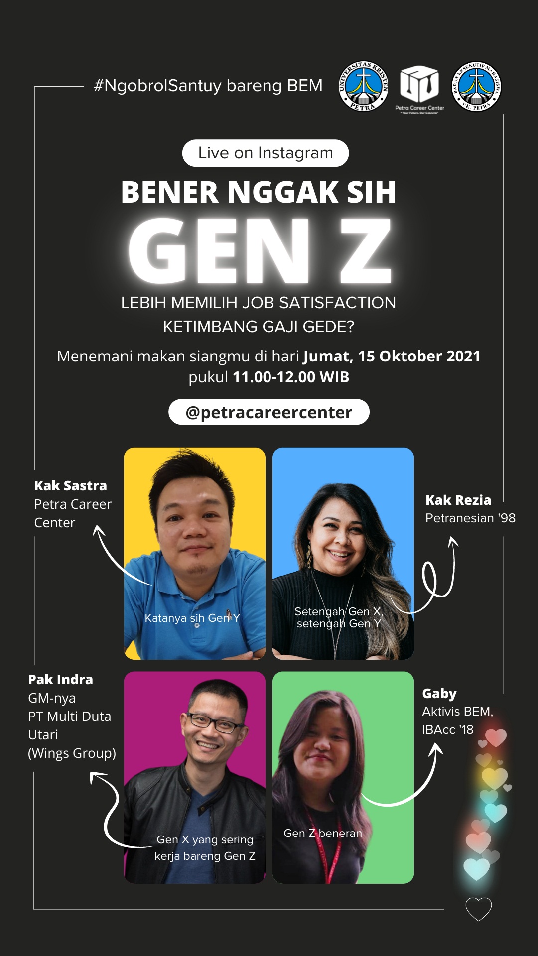 Pusat Karir Universitas Kristen Petra Surabaya bekerja sama dengan BEM UK Petra, mengadakan acara "Ngobrol santuy bareng BEM, live on Instagram: bener nggak sih gen Z lebih memilih job satisfaction ketimbang gaji gede?". Acara ini didakan pada tanggal 15 Oktober 2021 jam 11.00 - 12.00 WIB. Ada beberapa narasumber yang akan sharing, acara ini dilaksanakan melalui live IG @petracareercenter.