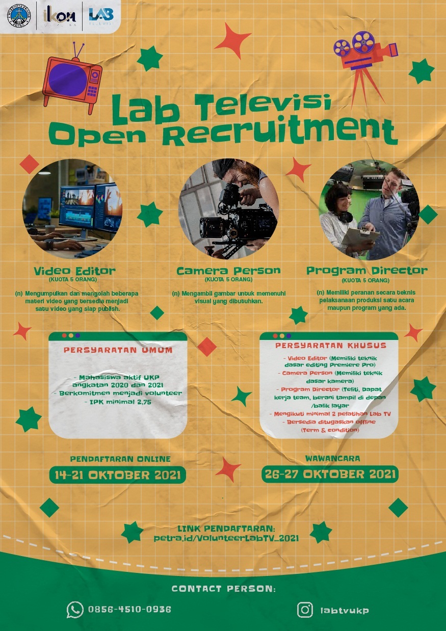 Laboratorium Televisi Program Studi Ilmu Komunikasi UK Petra, membuka kesempatan bagi mahasiswa UK Petra angkatan tahun 2020-2021 dengan IPK minimal 2,75 untuk magang di Lab TV Ilmu Komunikasi UK Petra. Pendaftaran online dibuka pada 14 - 21 Oktober 2021, sedangkan wawancara diadakan pada 26 - 27 Oktober 2021.