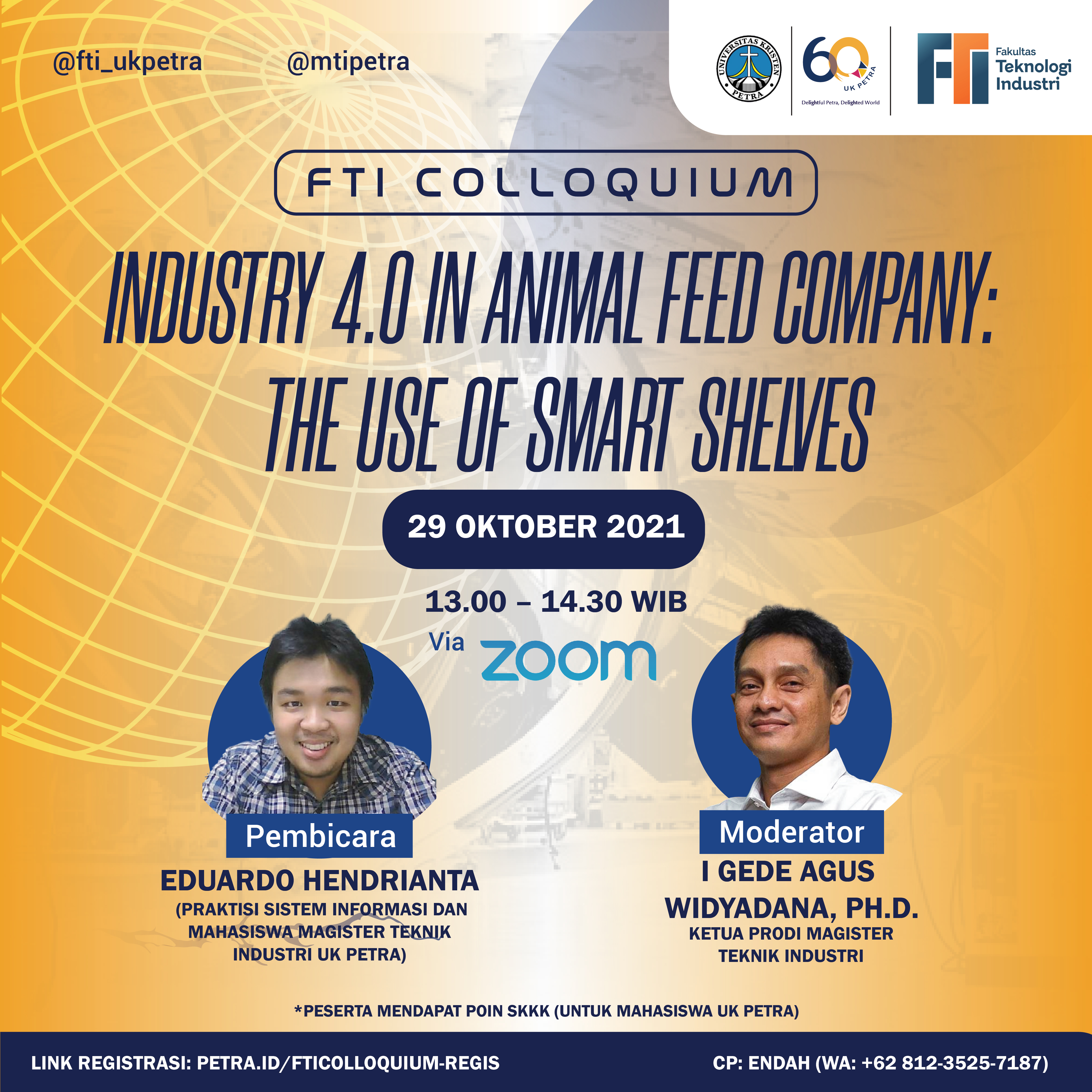 Pada tanggal 29 Oktober 2021, Fakultas Teknologi Industri UK Petra Surabaya mengadakan seminar dengan topik "Industry 4.0 in animal feed company: the use of smart shelves". Dengan narasumber Eduardo Hendrianta dan sebagai moderator I Gede Agus Widyadana. Acara ini akan berlangsung secara online dengan aplikasi Zoom.