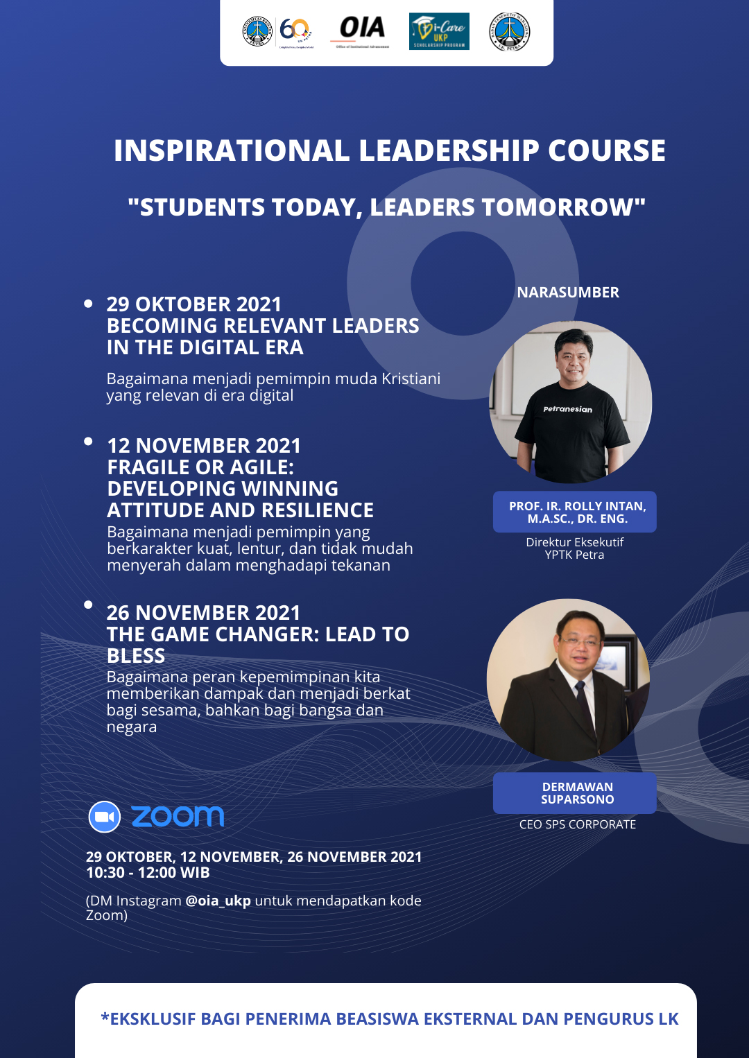 Pada tanggal 29 Oktober 2021 dan 12 November 2021 serta 26 November 2021, Universitas Kristen Petra Surabaya mengadakan acara Inspirational leadership course. Kegiatan ini diperuntukkan bagi mahasiswa pnerima beasiswa serta pengurus lembaga kemahasiswaan.Hadir sebagai narasumber ialah Prof. Ir. Rolly Intan serta Dermawan Suparsono. Acara ini diselenggarakan secara daring melalui aplikasi Zoom.