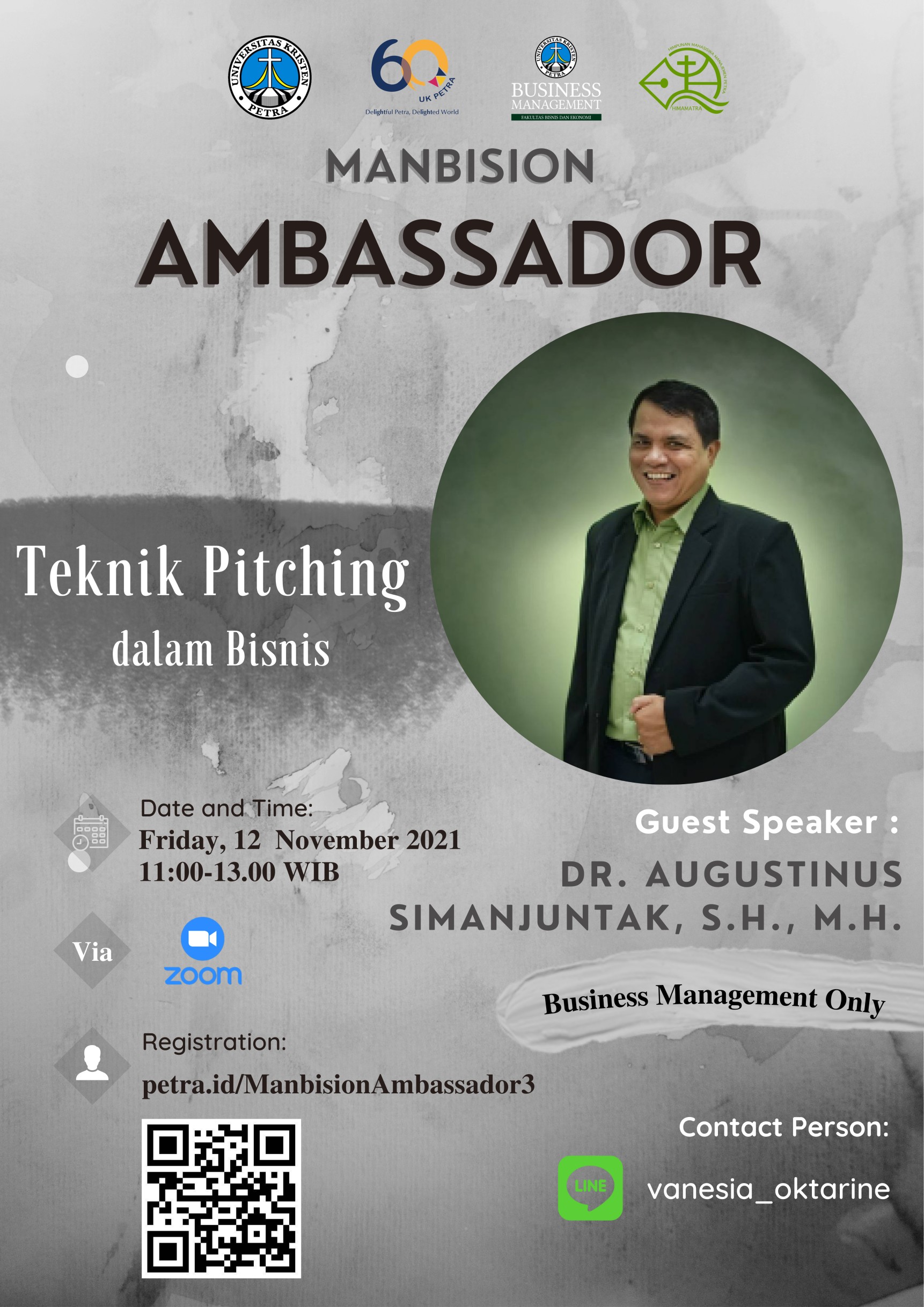 Pada tanggal 12 November 2021 jam 11.00 - 13.00 WIB, program Manajemen Bisnis UK Petra mengadakan acara Manbision Ambassador: teknik pitching dalam bisnis. Dengan Narasumber bapak Dr. Augustinus Simanjuntak S.H., M.H. Acara ini berlangsung secara daring dengan aplikasi Zoom.