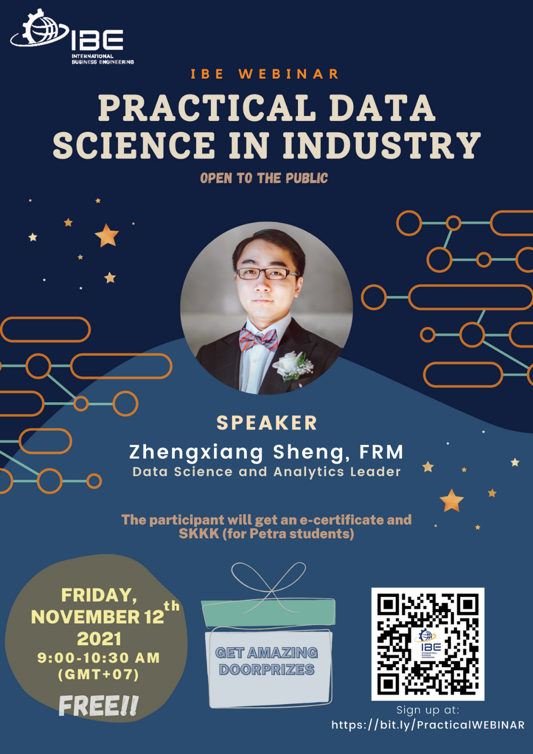 Webinar: practical data science in industry, akan diadakan oleh Program International Business Engineering Universitas Kristen Petra Surabaya pada tanggal 12 November 2021, jam 09.00 - 10.30 WIB. Dengan narasumber Zhengxiang Sheng, FRM. Untuk info pendaftaran silahkan lihat http://bit.ly/PracticalWEBINAR.