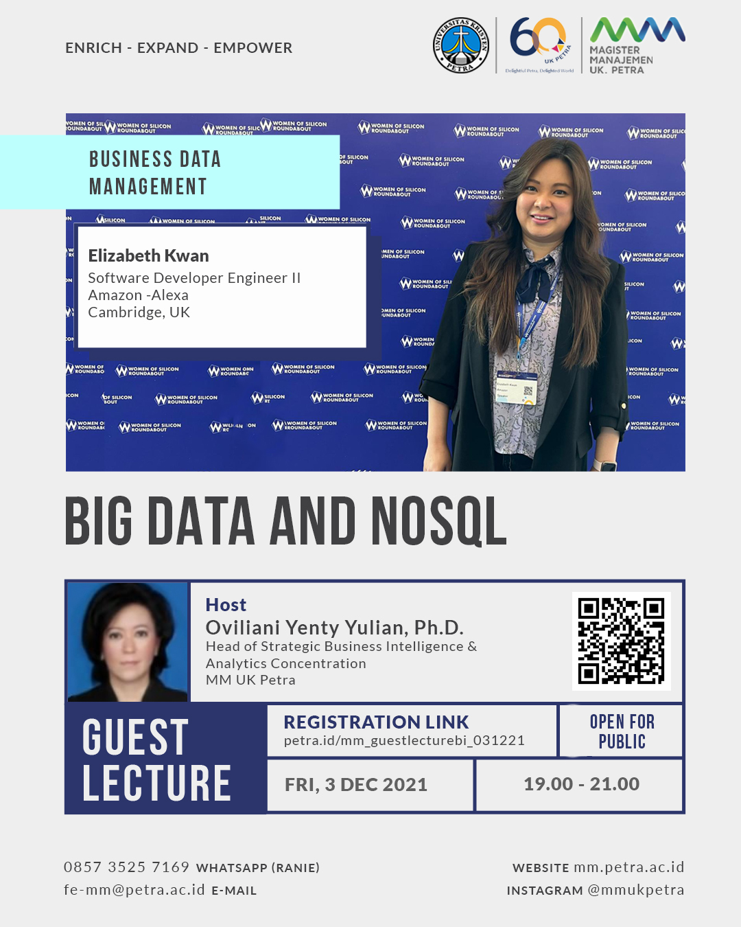 Kuliah tamu business data management: big data and nosql, akan dilaksanakan oleh Program Studi Magister Manajemen UK Petra pada tanggal 03 Desember 2021 jam 19.00 - 21.00 WIB dengan nara sumber Elizabeth Kwan dan sebagai host Oviliani Yenty Yulian.