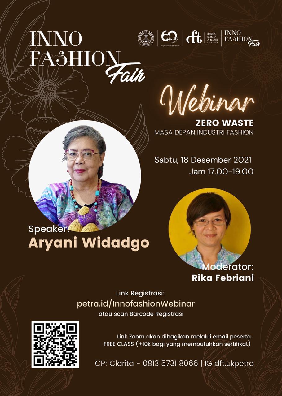 Didalam memeriahkan acara Innofashion fair 2021, Fakultas Seni dan Desain UK Petra mengadakan webinar zero waste: masa depan industri fashion. Acara ini dilaksanakan pada tanggal 18 Desember 2021 jam 17.00 - 19.00 WIB dengan narasumber ibu Aryani Widagdo dan sebagai moderator adalah ibu Rika Febriani. Acara ini akan diselnggarakan secara online melalui aplikasi Zoom.