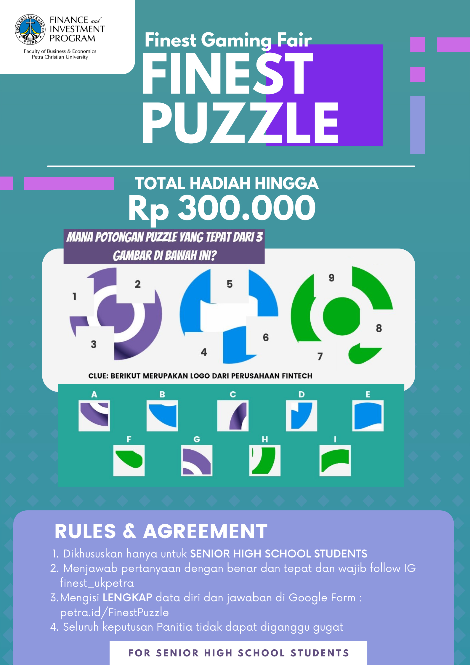 Program Manajemen Keuangan Universitas Kristen Petra Surabaya, mengadakan kuis berhadiah. Untuk keterangan lebih lanjut silahkan dilihat di Petra.id/FinestPuzzle