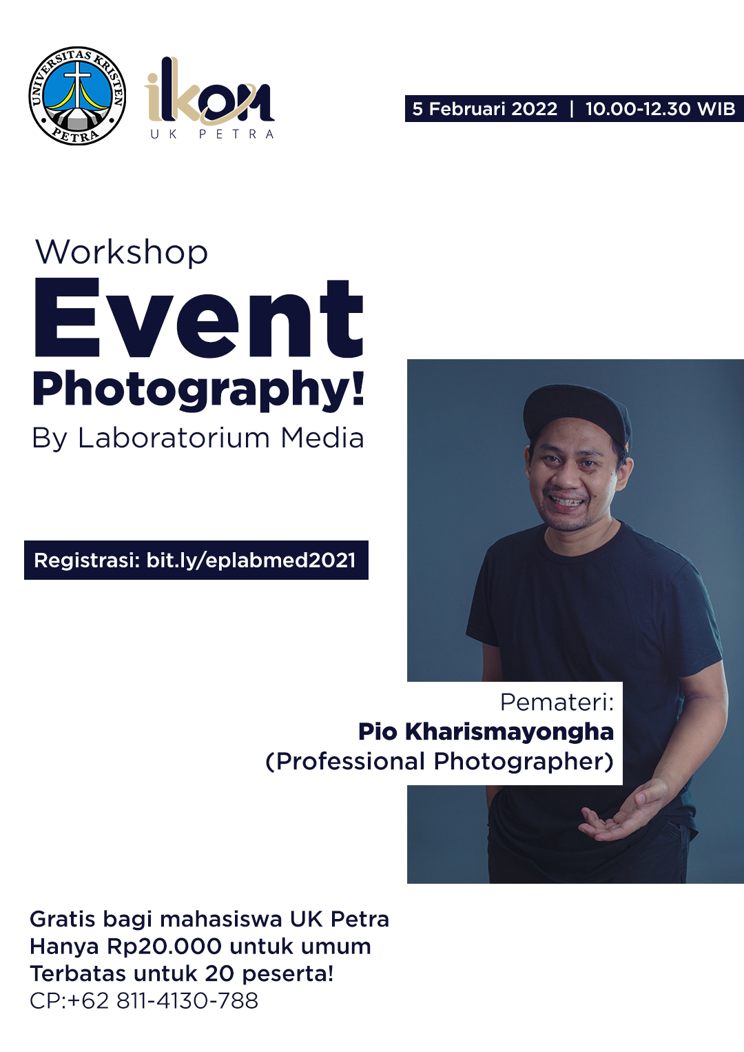 Program Studi Ilmu Komunikasi Universitas Krisaten Petra Surabaya, pada tanggal 05 Februari 2022 mengadakan acara workshop event photography. Untuk registrasi ada di link bit.ly/eplabmed2021. Dengan menghadirkan Pio Kharismayongha sebagai narasumber, acara ini terbatas hanya untuk 20 peserta.