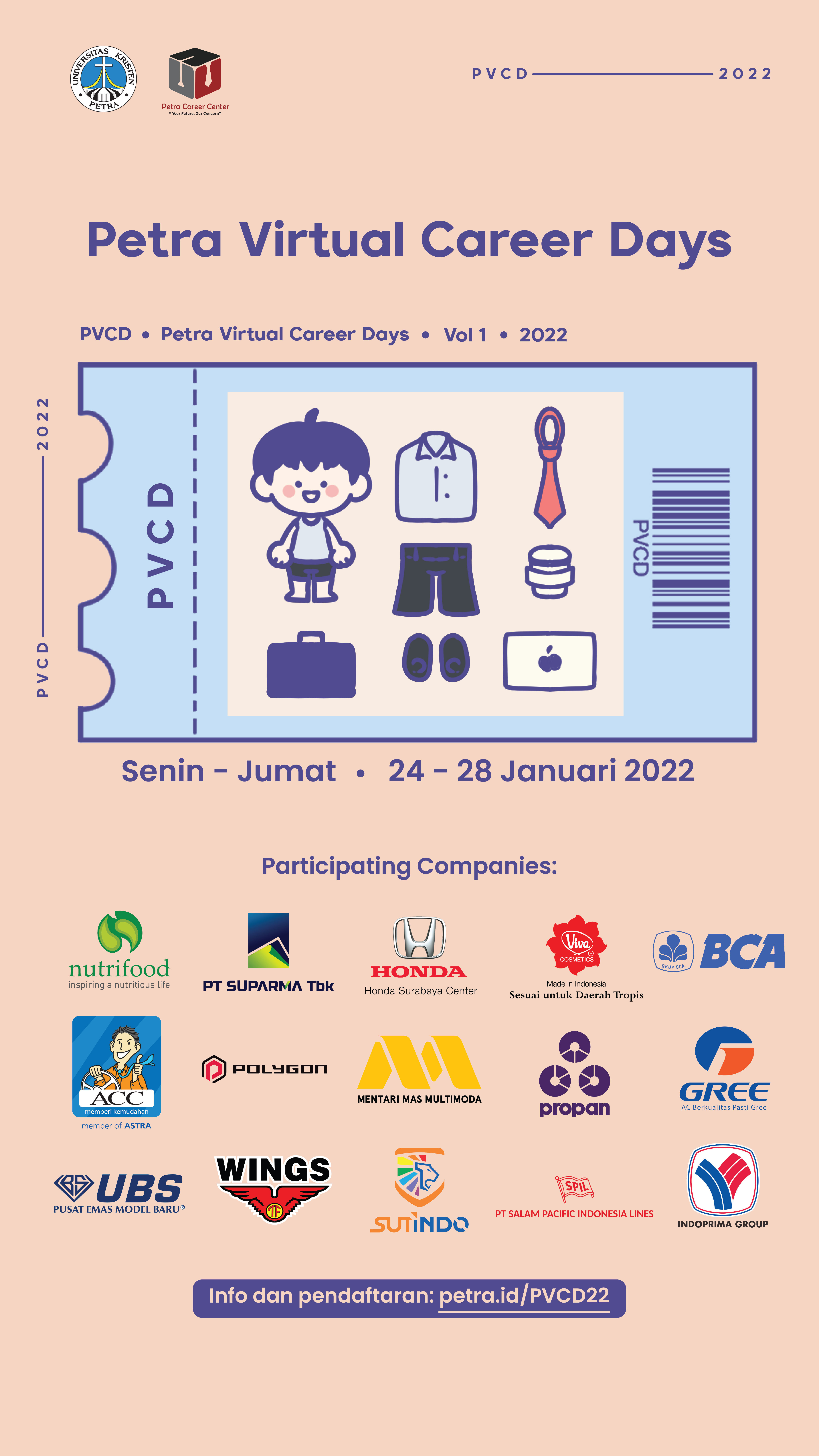 Petra Career Center memfasilitasi bagi para lulusan yang mencari kerja untuk bisa mengikuti rekruitment yang dilakukan secara online dengan mengundang perusahaan-perusahaan yang bekerjasama dengan Petra Career Center dan perusahaan yang keren. Acara ini berlangsung dari tanggal 24-28 Januari 2022. dan dilaksanakan secara online.