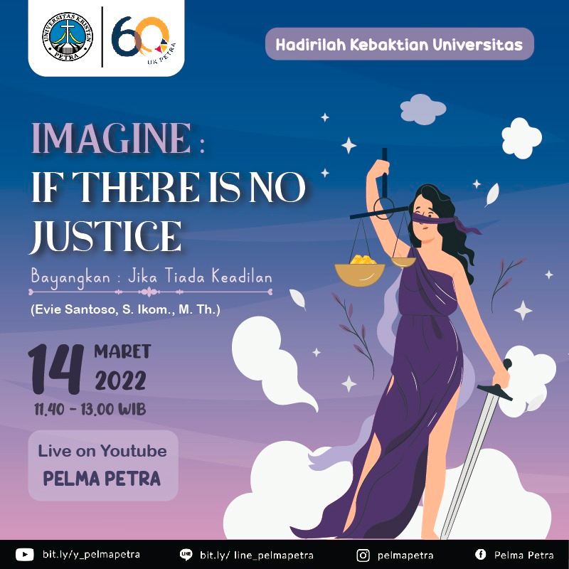 Kebaktian Universitas setiap hari Senin dengan tema "Imagine if there is no justice (bayangkan jika tiada keadilan)" diadakan pada tanggal 14 Maret 2022 jam 11.30 - 13.00 WIB. Dengan pengkhotbah Evie Santoso, S.Ikom., M.Th. Dilaksanakan secara daring melalui channel Youtube Pelma Petra.