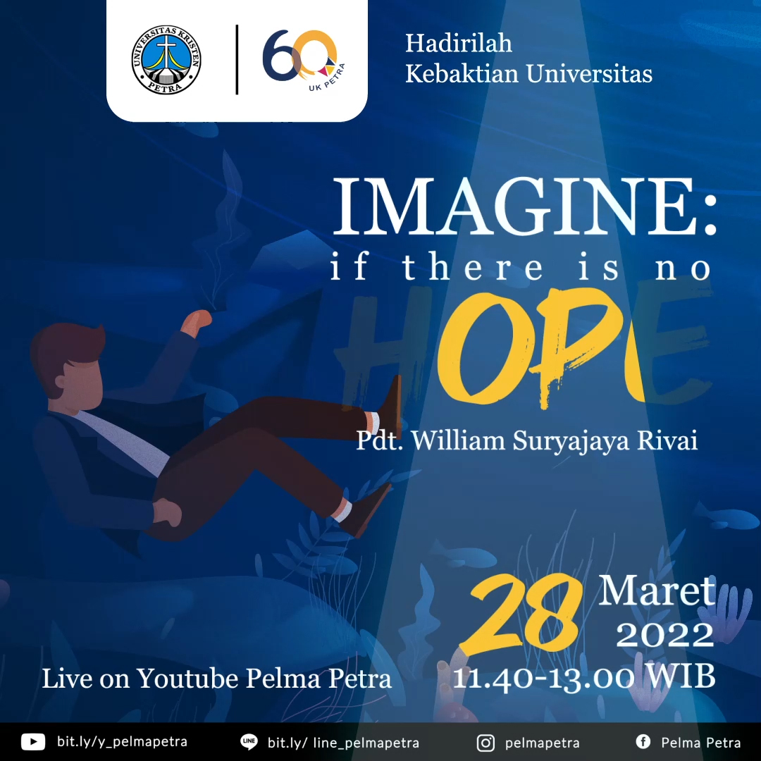 Kebaktian universitas yang diadakan setiap hari Senin, kembali mengundang seluruh civitas UK Petra untuk hadir dalam acara ini. Dengan bertemakan Imagine if there is no hope (bayangkan jika tiada harapan) kebaktian kali ini diadakan pada Senin, 28 Maret 2022 jam 11.40 - 13.00 WIB. Dengan pengkhotbah bapak Pdt. William Suryajaya Rivai.