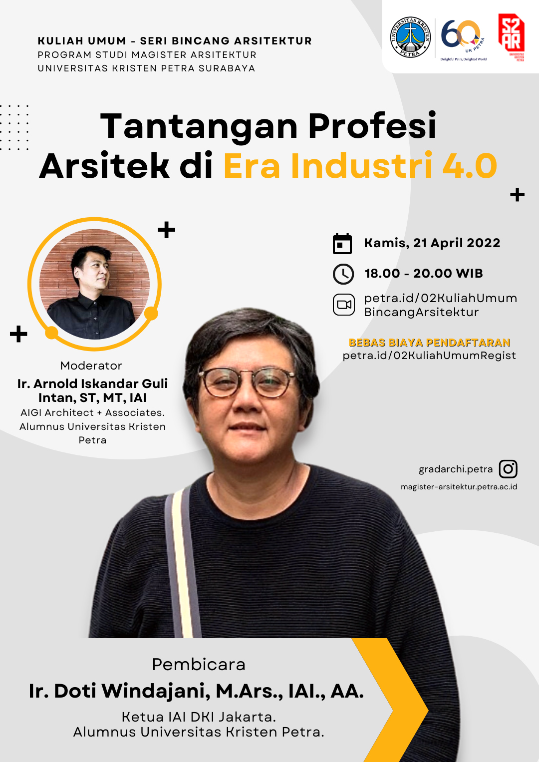 Kuliah umum seri bincang arsitektur dengan mengankat tema tantangan profesi arsitek di era industri 4.0 akan diadakan oleh Program Studi Magister Arsitektur UK Petra pada tanggal 21 April 2022 jam 18.00 -20.00 WIB. Dengan narasumber Ir. Doti Windajani, M.Ars.