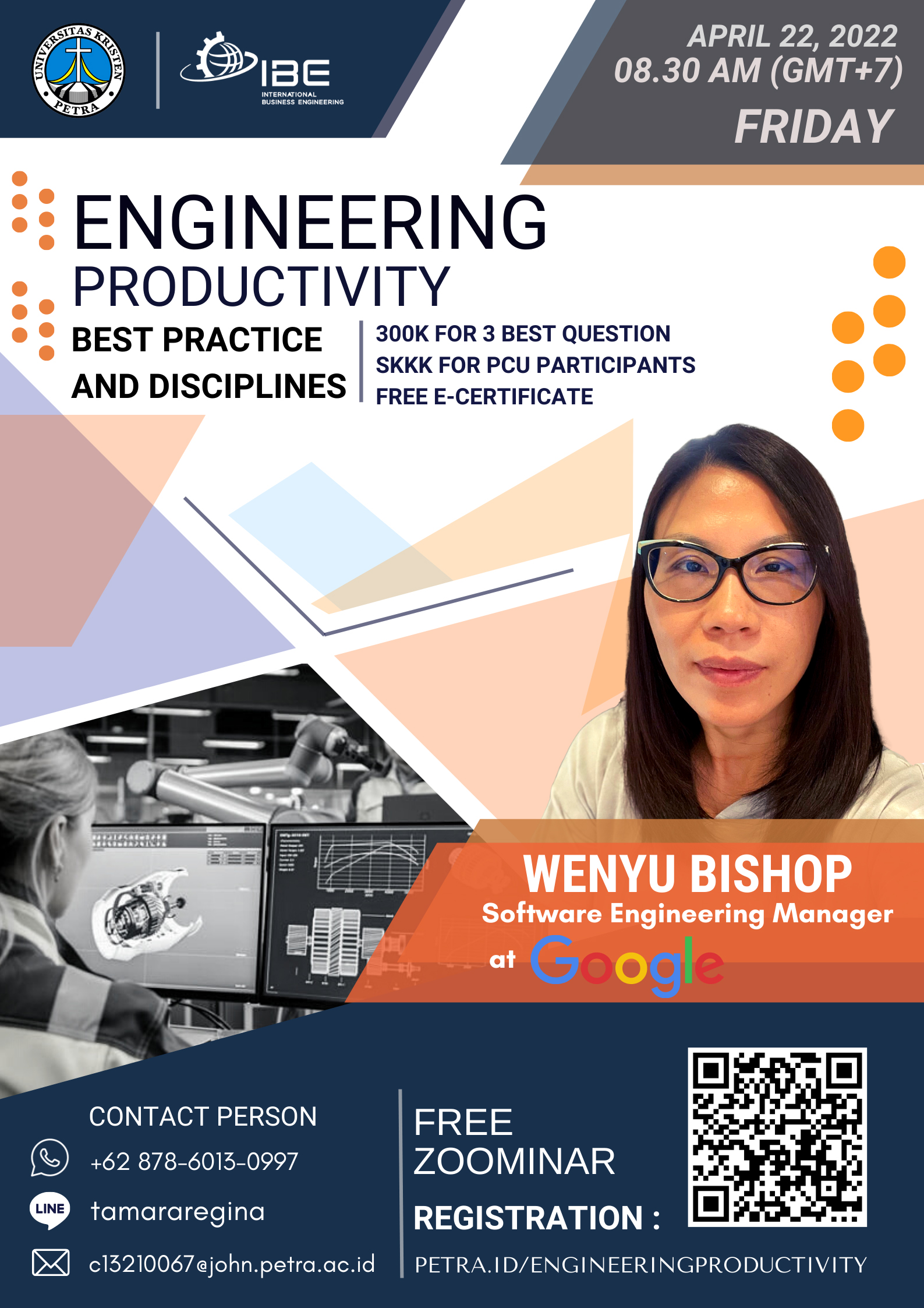 Pada tanggal 22 April 2022 Jam 08.30 - selesai, Program International Business Engineering Universitas Kristen Petra Surabaya mengadakan acara webinar dengan topik Engineering productivity best practice and disciplines. Acara ini adalah webinar melalui zoom, yang mengundang Wenyu Bishop sebagai pembicara. Dia adalah seorang Software Engineering Manager di google. Di webinar ini dia akan membicarakan tentang salah satu cara kerja Google dalam memproduksi produk yang berkualitas dengan efisien, dia juga akan berbagi perjalanan karirnya sampai bisa mendapat pekerjaan di google, dan alasan mengapa dia fokus ke bidang Engineering Productivity.