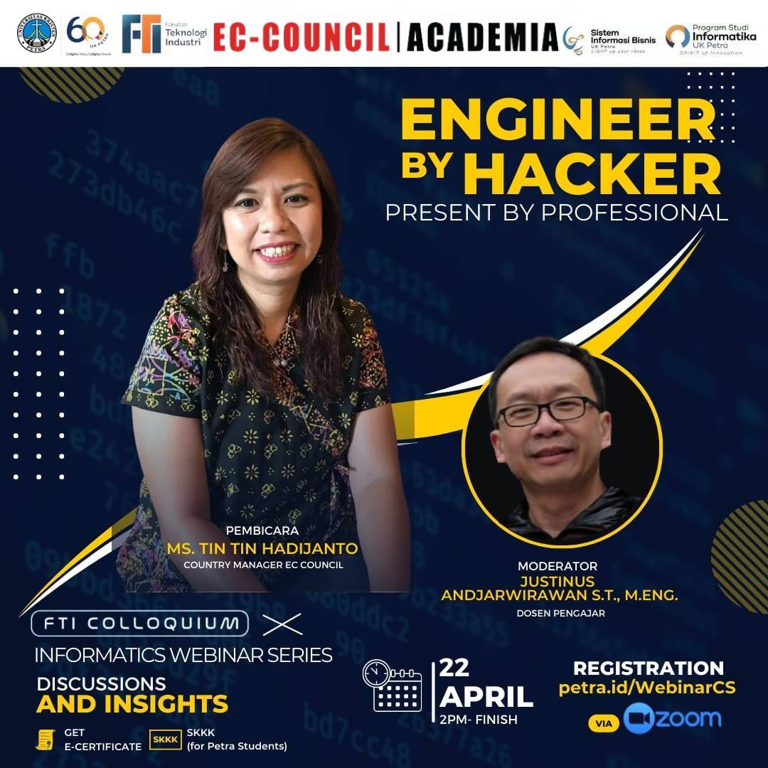 FTI Colloquium: engineer by hacker diadakan oleh Fakultas Teknologi Industri Universitas Kristen Petra Surabaya pada Jumat, 22 April 2022 jam 14.00-selesai. Dengan pembicara Ms. Tin Tin Handijanto dan sebagai moderator Bpk. Justinus Andjarwirawan, S.T., M.Eng. Acara ini dilaksanakan secara daring melalui aplikasi Zoom.