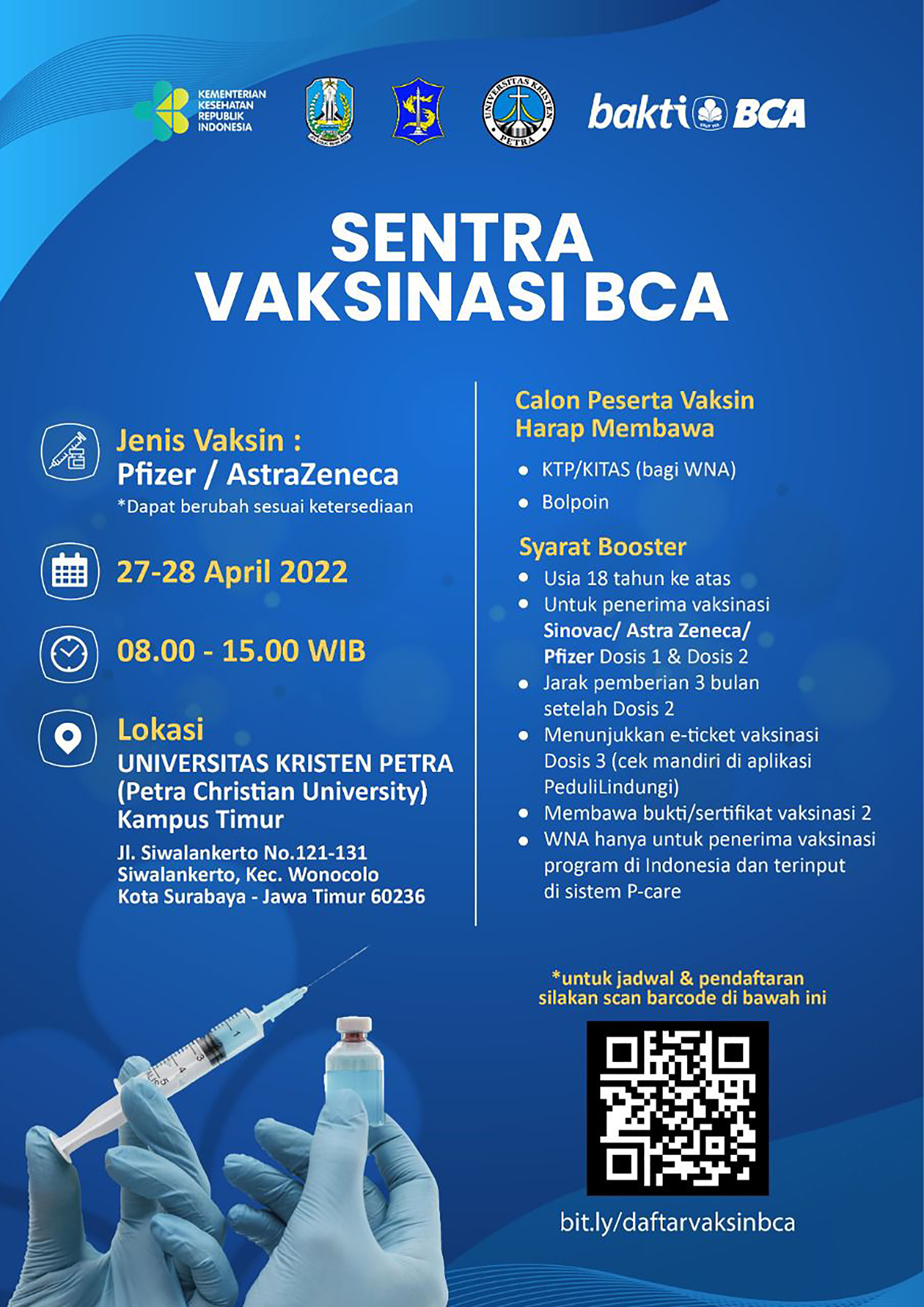 Didalam rangka menyukseskan program vaksinasi covid-19, Universitas Kristen Petra bekerjasama dengan BCA mengadakan program vaksinasi pada tanggal 27-28 April 2022 jam 08.00 - 15.00 WIB, bertempat di kampus Timur Universitas Kristen Petra Surabaya.