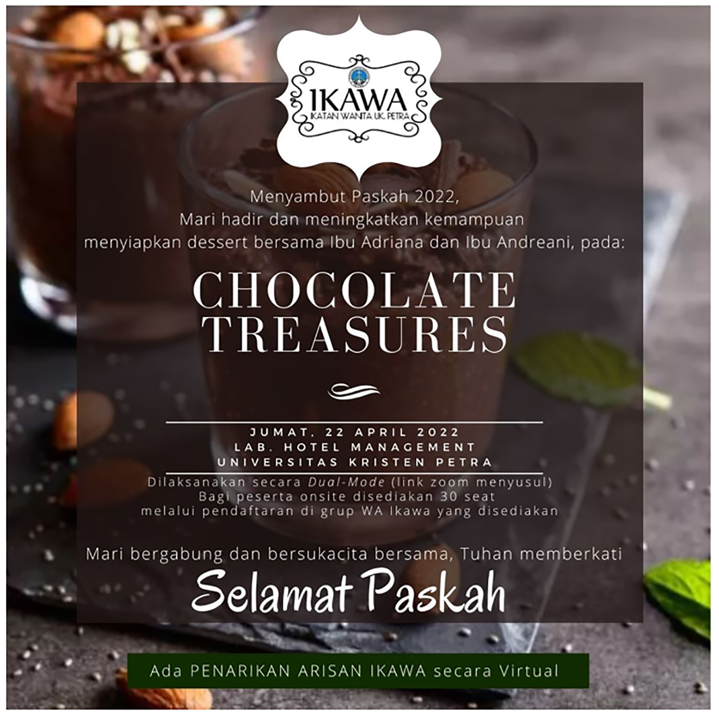 Didalam merayakan hari Paskah 2022, Ikawan Wanita UK Petra (IKAWA) pada tanggal 22 April 2022 jam 11.00 WIB mengadakan pertemuan rutin tiap bulan. Dalam pertemuan ini akan diadakan pelatihan membuat dessert bersama ibu Adriana dan ibu Andreani dari Manajemen Perhotelan UK Petra.