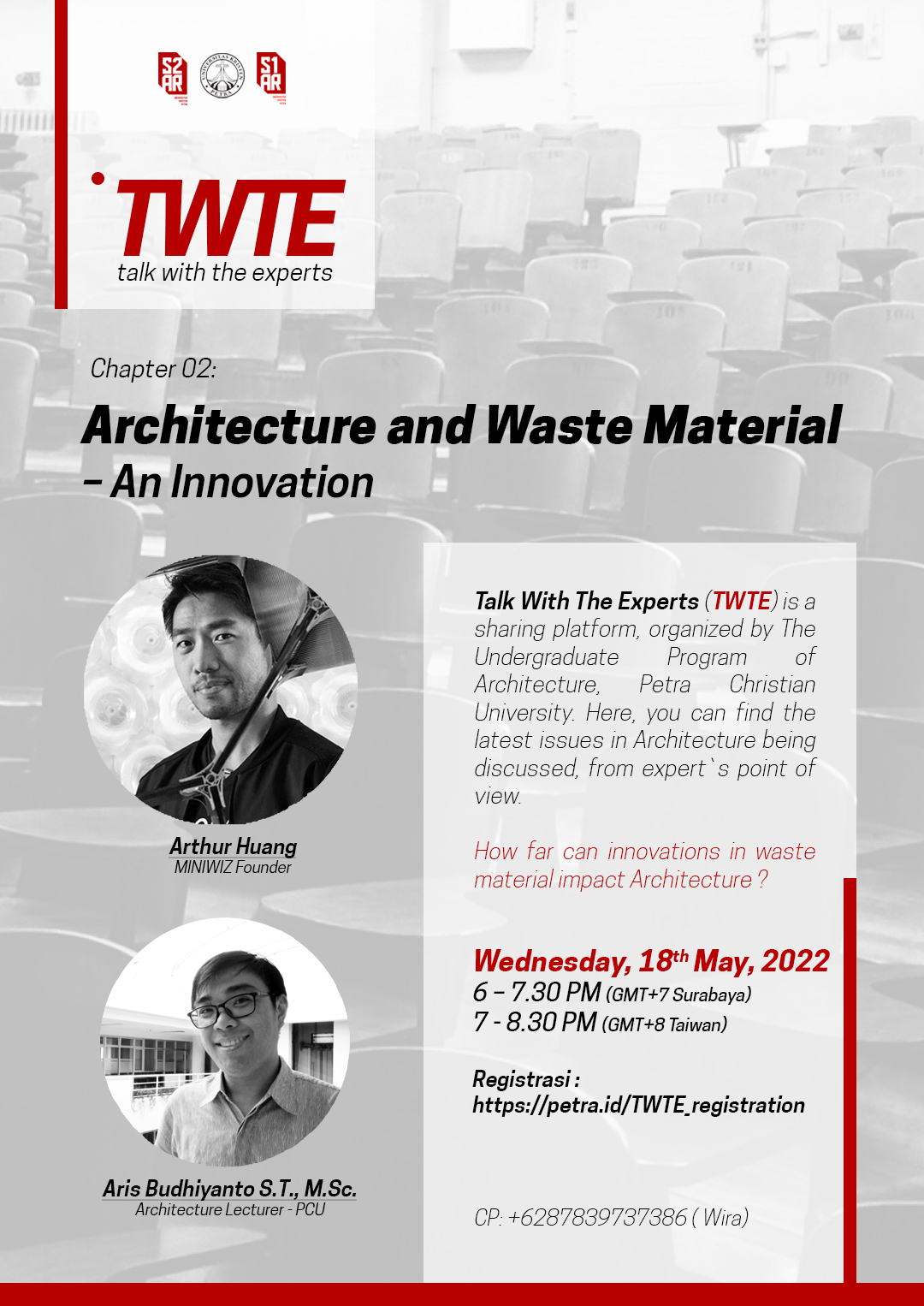 Pada tanggal 18 Mei 2022, jam 18.00 - 19.30 WIB, Program Studi Teknik Architecture UK Petra Mengadakan acara TWTE (Talk With The Experts) chapter 2: Architecture and waste material - an innovation. Dengan narasumber Arthur Huang dan Aris Budhiyanto. Info registrasi ada di petra.id/TWTE_registration.