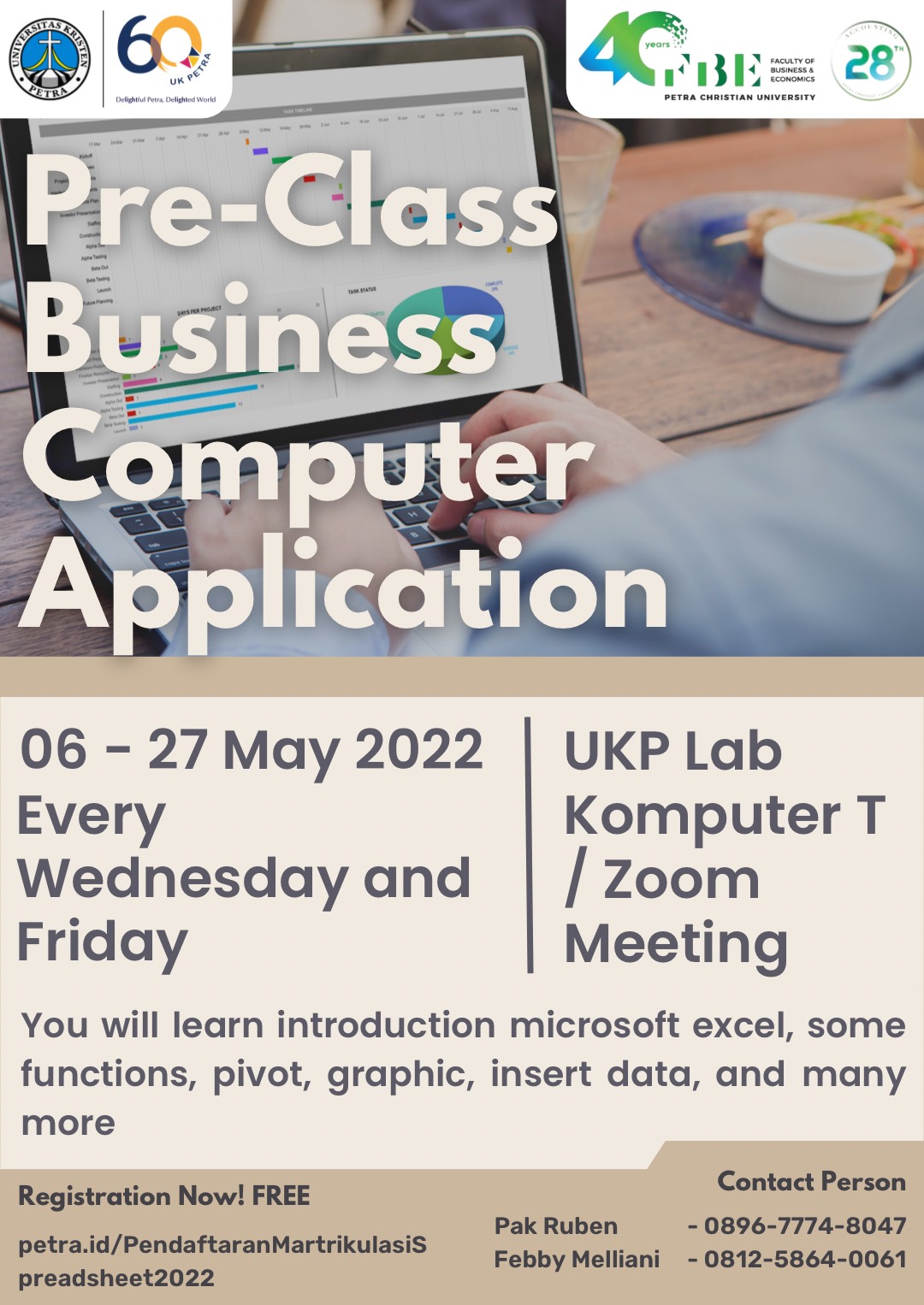 Program Studi Akuntansi Universitas Kristen Petra Surabaya mengadakan acara "Pre class computer business". Kegiatan ini sebagai pengantar bagi calon mahasiswa baru program studi akuntansi sebelum mengikuti mata kuliah business computer analysis. Acara ini dilaksanakan pada 06 -27 Mei 2022 (setiap hariu Rabu dan Jumat) di ruang Laboratorium Komputer gedung T.