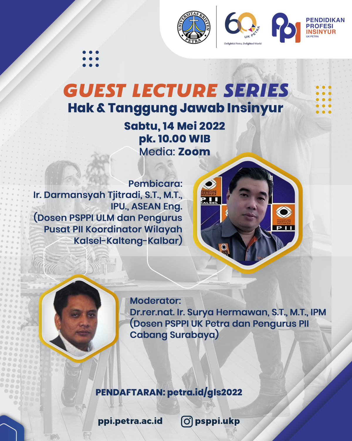 Sabtu, 14 Mei 2022 jam 10.00 WIB, Pendidikan Profesi Insinyur UK Petra Surabaya mengadakan kuliah tamu dengan topik "hak dan tanggung jawab insinyur". Dengan narasumber Ir. Dharmansyah Tjitradi dan sebagai moderator Ir. Surya Hermawan. Acara ini dilaksanakan secara online melalui aplikasi Zoom.