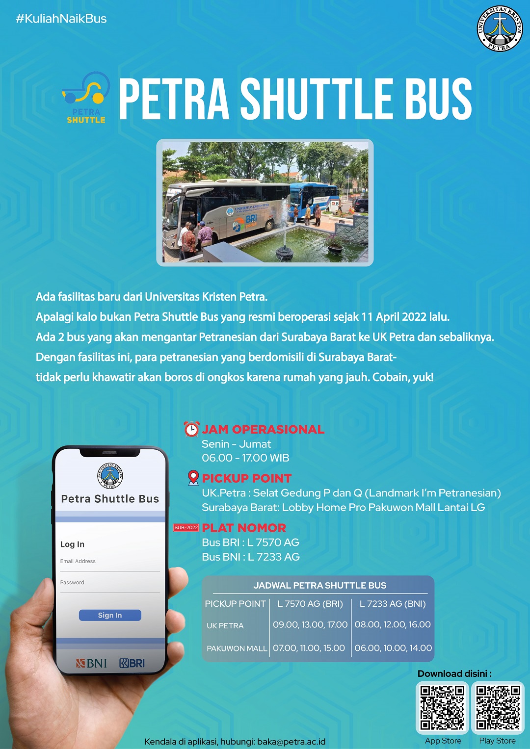 Didalam rangka mengurangi kemacetan disaat masa perkuliahan, maka Universitas Kristen Petra Surabaya mengadakan transportasi gratis untuk wilayah Surabaya Barat - Kampus UK Petra. Kegiatan ini menggunakan 2 bus.
