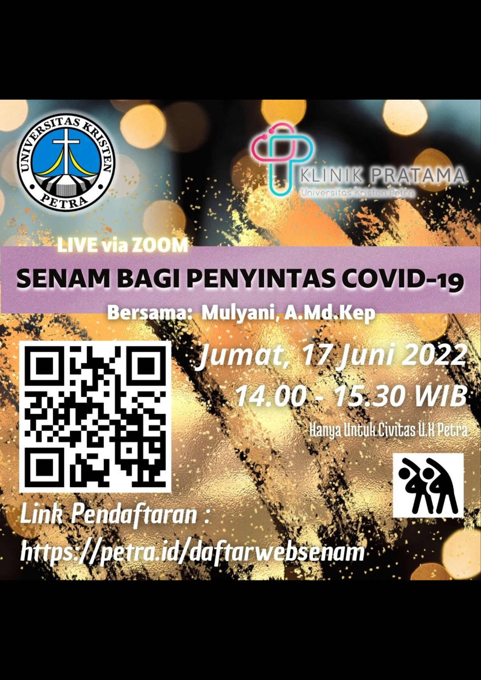 Pada tanggal 17 Juni 2022 jam 14.00 - 15.30 WIB, Unit Poliklinik UK Petra Surabaya mengadakan acara pelatihan online bersama "SENAM BAGI PENYINTAS COVID-19" khusus untuk civitas U.K Petra. Dengan narasumber Mulyani, A.Md.Kep. Dilaksanakan secara online melalui aplikasi Zoom.