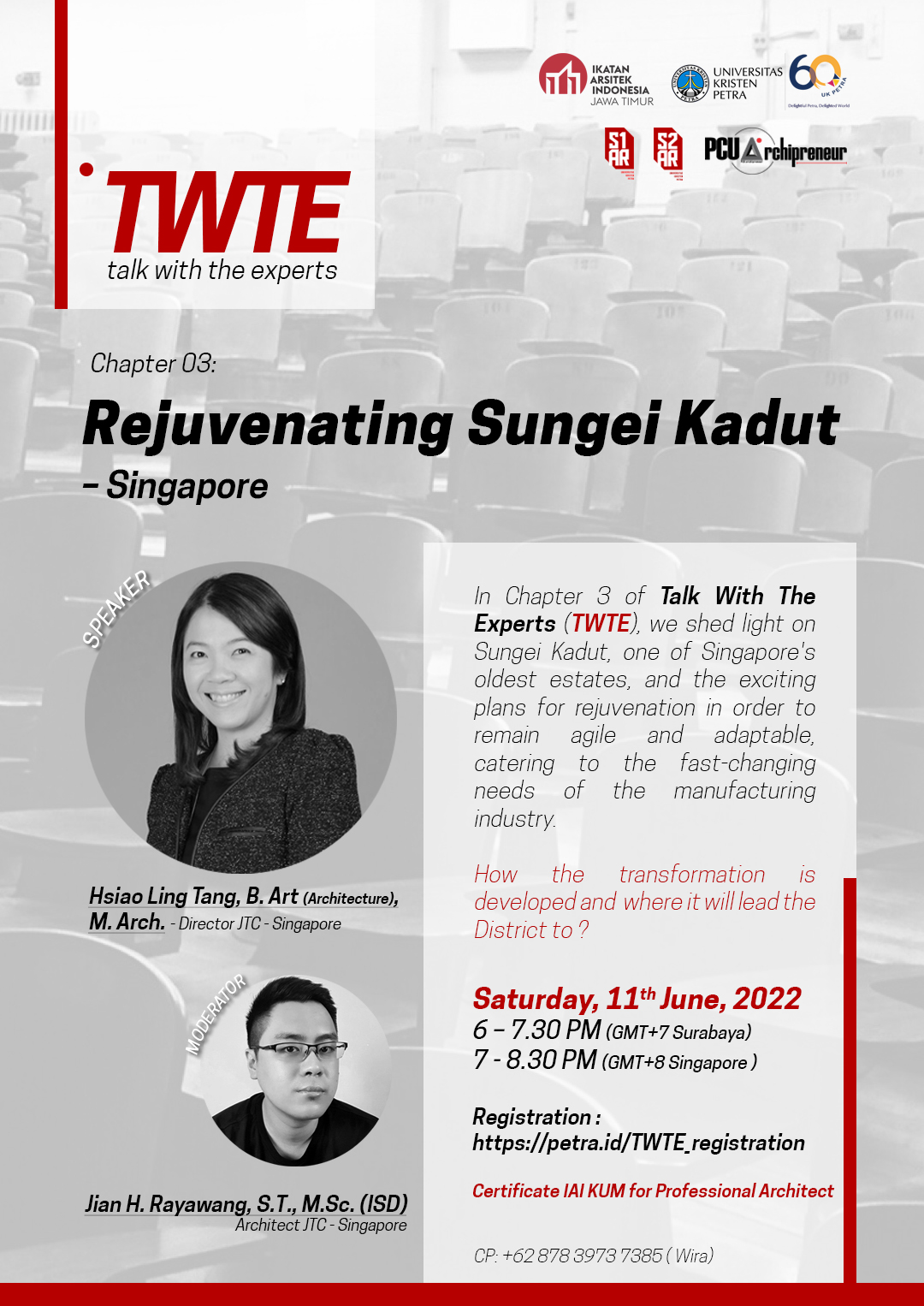 Webinar dengan topik Rejuvenating Sungei Kadut - Singapore, akan diadakan oleh Program Studi Teknik Arsitektur UK Petra Surabaya. Acara ini dilaksanakan pada tanggal 11 Juni 2022 jam 16.00 - 17.30 WIB. Salah satu rangkaian acara TWTE (Talk With The Experts), pada kali ini memasuki chapter ke-3 dengan narasumber Hsiao Ling Tang, B. Art., M. Arch dan Jian H. Rayawang, S.T., M.Sc.