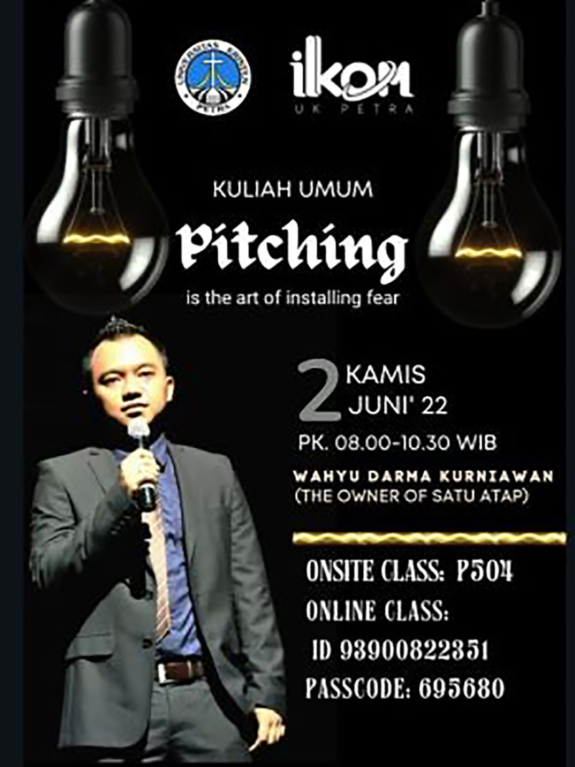 Program Studi Ilmu Komunikasi UK Petra mengadakan kuliah umum dengan tema Pitching dengan narasumber bapak Wahyu Darma Kurniawan. Acara ini dilaksanakan pada tanggal 02 Juni 2022 jam 08.00 - 10.30 WIB.