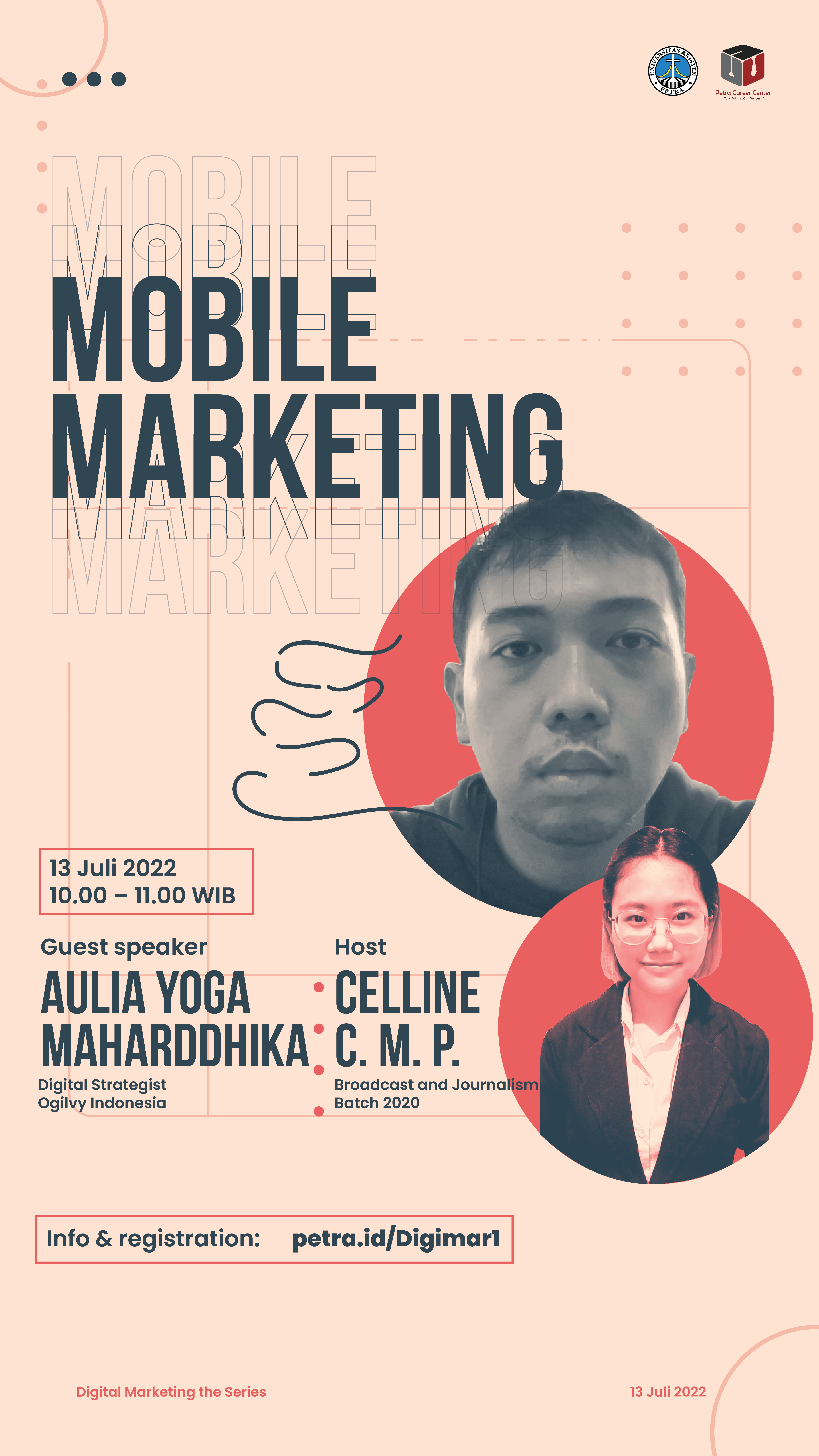 Webinar Digital marketing the series - mobile marketing diadakan oleh Pusat Karir Universitas Kristen Petra Surabaya pada tanggal 13 Juli 2022 Jam 10.00 - 11.00 WIB. Dengan narasumber Aulia Yoga Mahardhika.