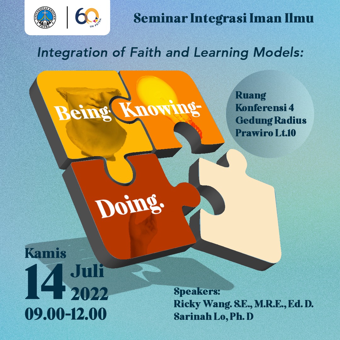 Seminar integrasi iman ilmu: integration of faith and learning models akan diadakan oleh Lembaga Pengembangan Kerohanian dan Kepemimpinan Kristen Universitas Kristen Petra Surabaya pada 14 Juli 2022 jam 09.00 - 12.00 WIB bertempat di Ruang Konferensi IV Gedung Radius Prawiro lantai 10. Narasumber pada acara ini yaitu Ricky Wang, S.E., M.R.E., E.d.D. dan Sarinah Lo, Ph.D.